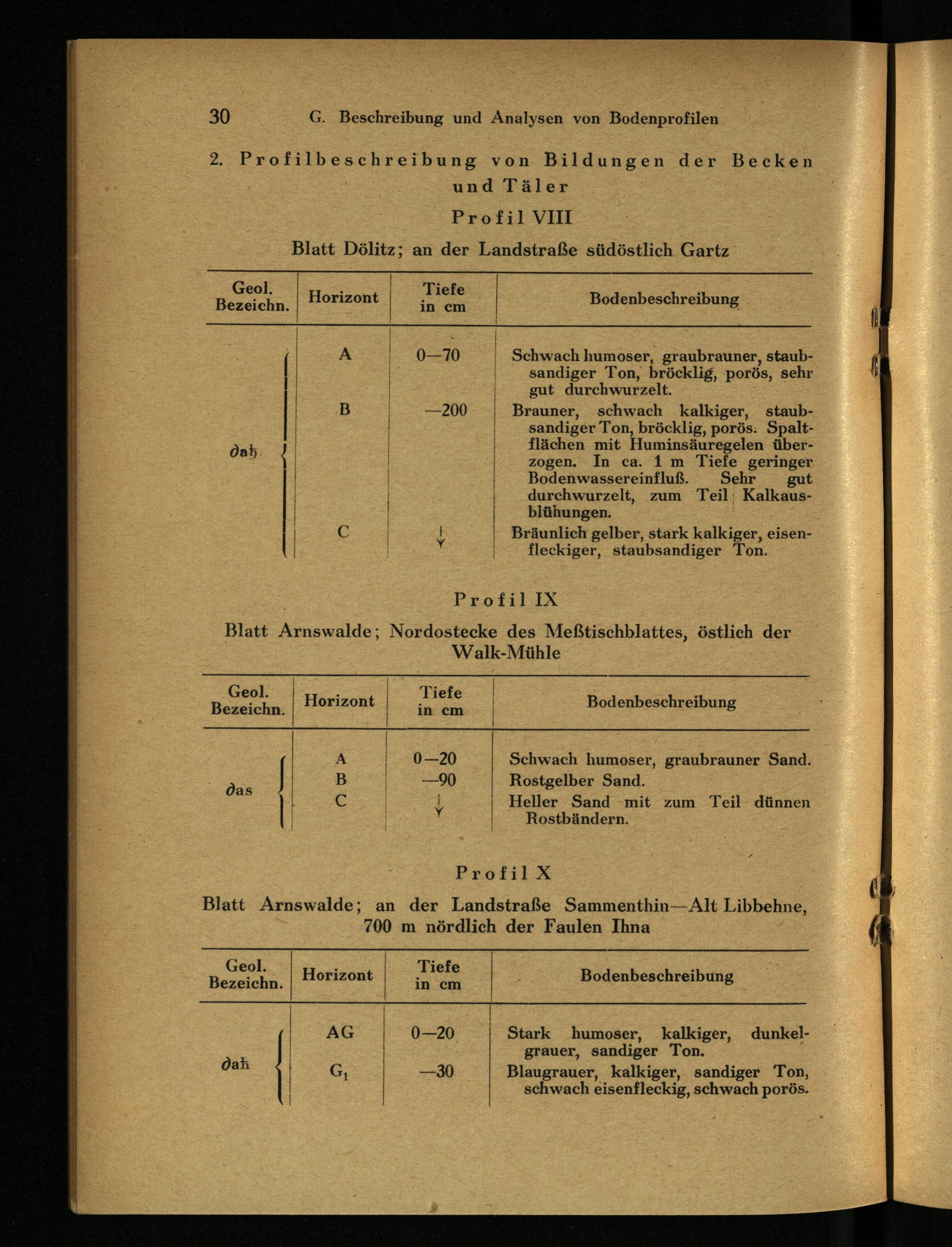 Brauner, schwach kalkiger, staubsandiger Ton, bröcklig, porös. Spaltflächen mit Huminsäuregelen überzogen. In ca. 1 m Tiefe geringer Bodenwassereinfluß. Sehr gut durchwurzelt, zum Teil Kalkausblühungen.