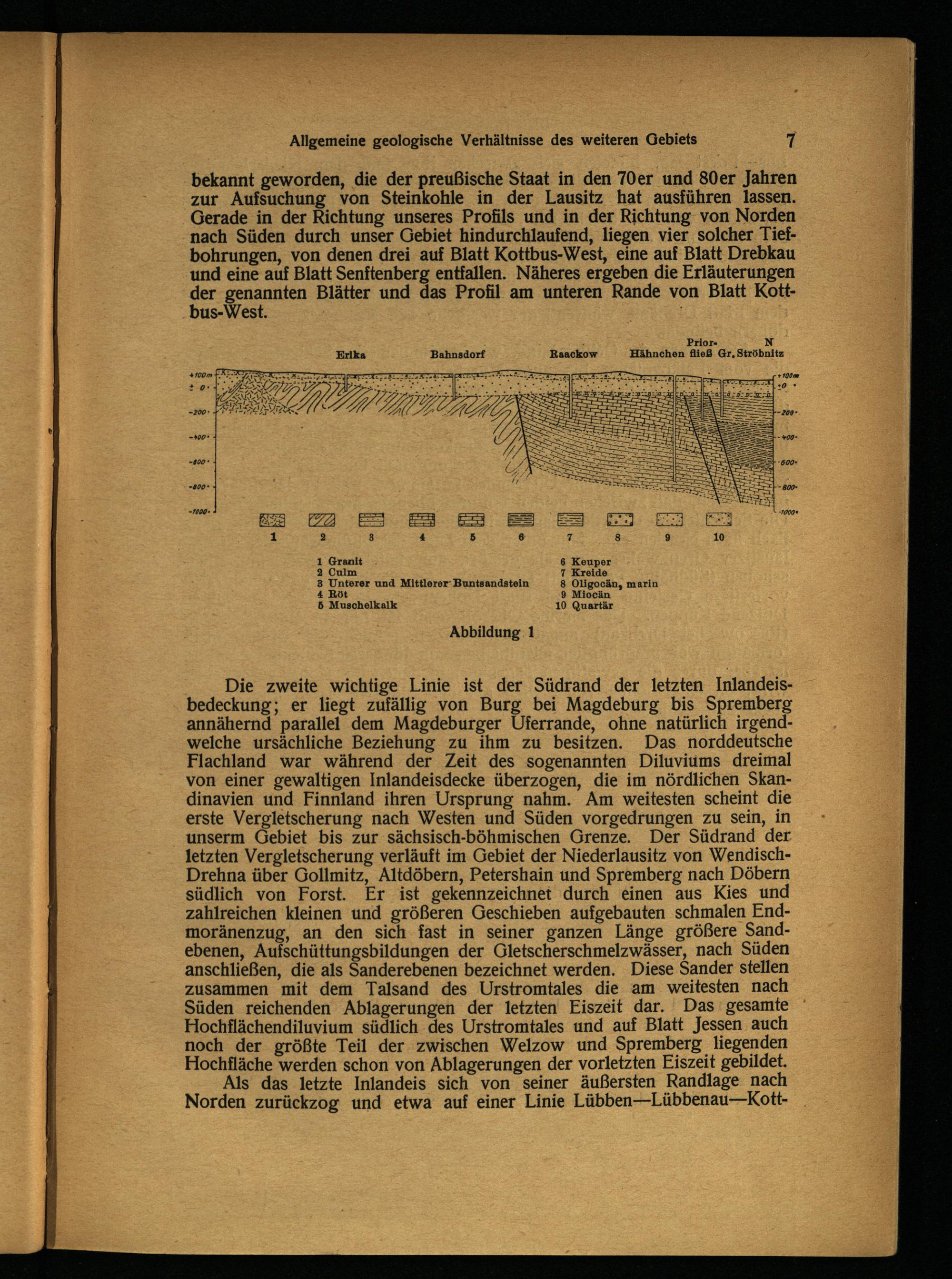 bekannt geworden, die der preußische Staat in den 70er und 80er Jahren zur Aufsuchung von Steinkohle in der Lausitz hat ausführen lassen. Gerade in der Richtung unseres Profils und in der Richtung von Norden nach Süden durch unser Gebiet hindurchlaufend, liegen vier solcher Tiefbohrungen, von denen drei auf Blatt Kottbus-West, eine auf Blatt Drebkau und eine auf Blatt Senftenberg entfallen. Näheres ergeben die Erläuterungen der genannten Blätter und das Profil am unteren Rande von Blatt Kottbus-West.