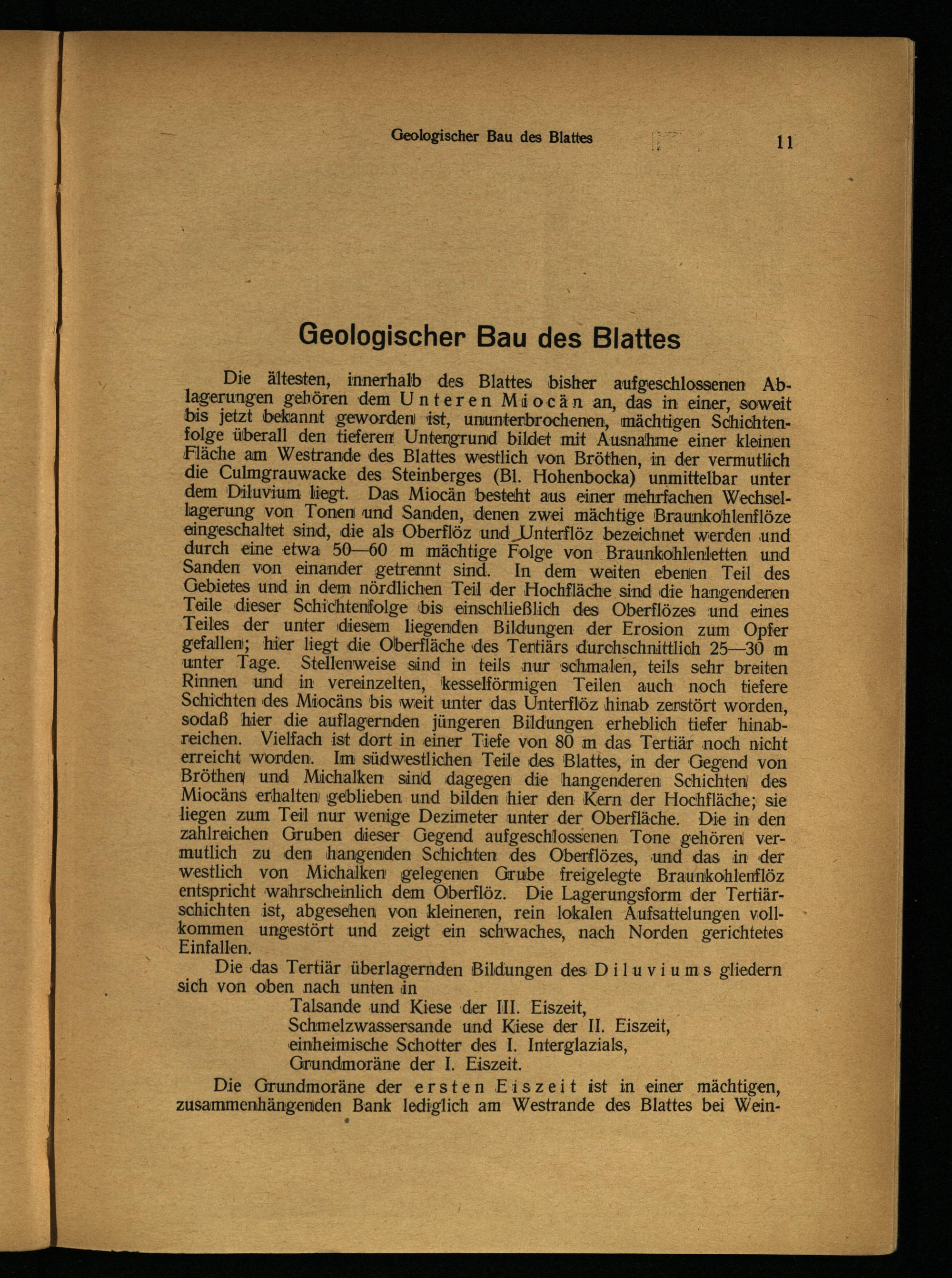 Die ältesten, innerhalb des Blattes bisher aufgeschlossenen Ablagerungen gehören dem Unteren Miocän an, das in einer, soweit bis jetzt bekannt geworden ist, ununterbrochenen, mächtigen Schichten- folge überall den tieferen Untergrund bildet mit Ausnahme einer kleinen Fläche am Westrande des Blattes westlich von Bröthen, in der vermutlich die Culmgrauwacke des Steinberges (Bl. Hohenbocka) unmittelbar unter dem Diluvium liegt. Das Miocän besteht aus einer mehrfachen Wechsellagerung von Tonen und Sanden , denen zwei mächtige ßraunkohlenflöze eingeschaltet sind, die als Oberflöz und Unterflöz bezeichnet werden und durch eine etwa 50—60 m mächtige Folge von Braunkohlenletten und Sanden von einander getrennt sind. In dem weiten ebenen Teil des Gebietes und in dem nördlichen Teil der Hochfläche sind die hängenderen Teile dieser Schichtenfolge bis einschließlich des Oberflözes und eines Teiles der unter diesem liegenden Bildungen der Erosion zum Opfer gefallen; hier liegt die Oberfläche des Tertiärs durchschnittlich 25—30 m unter Tage. Stellenweise sind in teils nur schmalen, teils sehr breiten Rinnen und in vereinzelten, kesselförmigen Teilen auch noch tiefere Schichten des Miocäns bis weit unter das Unterflöz hinab zerstört worden, sodaß hier die auflagernden jüngeren Bildungen erheblich tiefer hinabreichen. Vielfach ist dort in einer Tiefe von 80 m das Tertiär noch nicht erreicht worden. Im südwestlichen Teile des Blattes, in der Gegend von Bröthen und Michalken sind dagegen die hängenderen Schichten des Miocäns erhalten -geblieben und bilden hier den Kern der Hochfläche; sie liegen zum Teil nur wenige Dezimeter unter der Oberfläche. Die in den zahlreichen Gruben dieser Gegend aufgeschlossenen Tone gehören vermutlich zu den hangenden Schichten des Oberflözes, -und das in -der westlich von Michalken gelegenen Grube freigelegte Braunkohlenflöz entspricht wahrscheinlich dem Oberflöz. Die Lagerungsform der Tertiärschichten ist, abgesehen von kleineren, rein lokalen Aufsattelungen vollkommen ungestört und zeigt ein schwaches, nach Norden gerichtetes Einfallen.