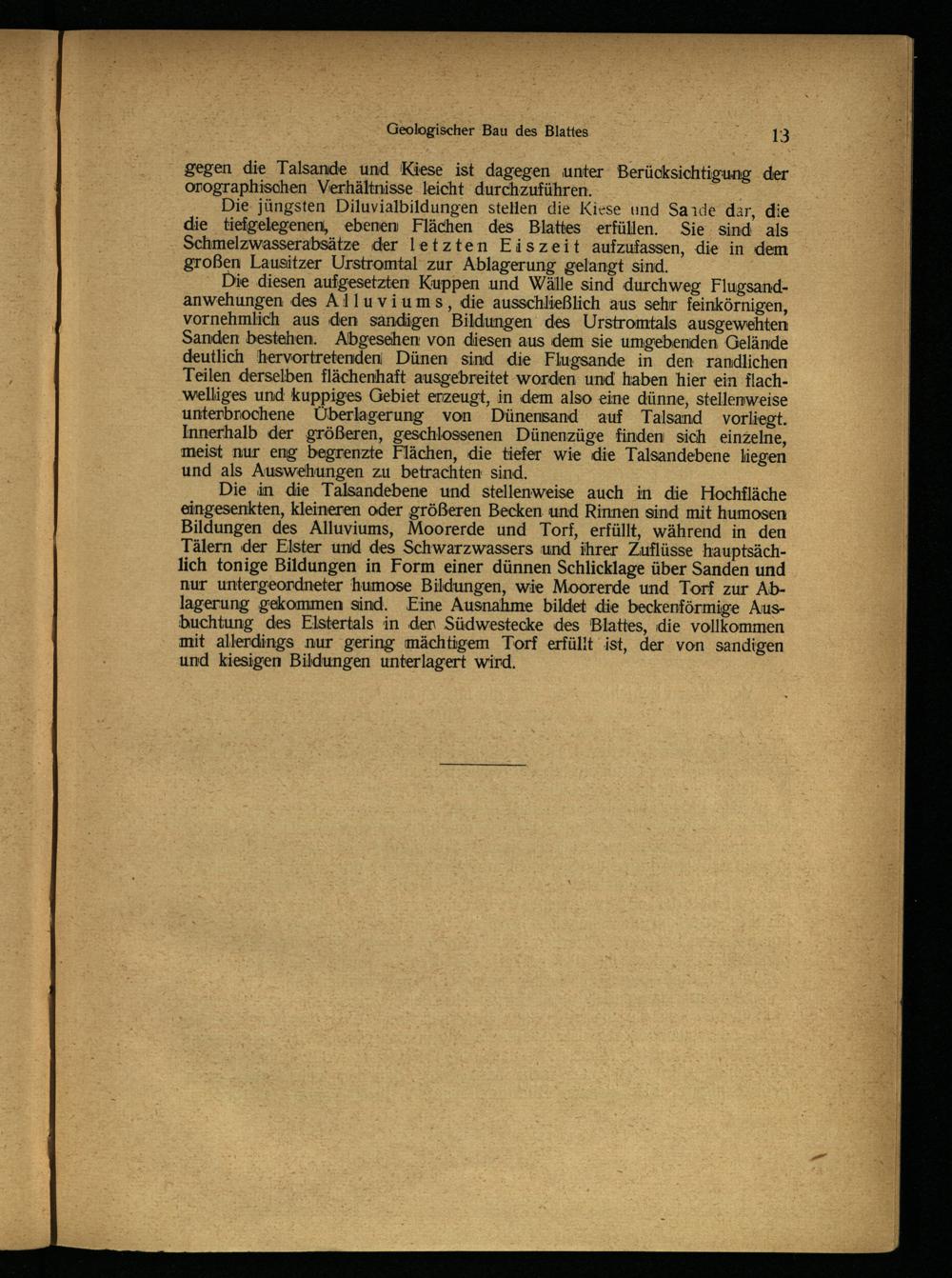 Die in die Talsandebene und stellenweise auch in die Hochfläche eingesenkten, kleineren oder größeren Becken und Rinnen sind mit humosen Bildungen des Alluviums, Moorerde und Torf, erfüllt, während in den Tälern der Elster und des Schwarzwassers und ihrer Zuflüsse hauptsächlich tonige Bildungen in Form einer dünnen Schlicklage über Sanden und nur untergeordneter humose Bildungen, wie Moorerde und Torf zur Ablagerung gekommen sind. Eine Ausnahme bildet die beckenförmige Ausbuchtung des Elstertals in der Südwestecke des Blattes, die vollkommen mit allerdings nur gering mächtigem Torf erfüllt ist, der von sandigen und kiesigen Bildungen unterlagert wird.