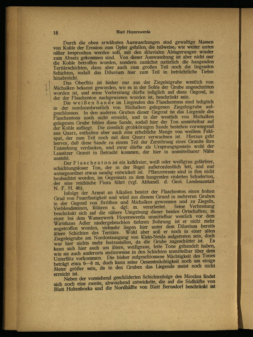 Infolge der Armut an Alkalien besitzt der Flaschenton einen hohen Grad von Feuerfestigkeit und wird aus diesem Grund in mehreren Gruben in der Gegend von Bröthen und Michalken gewonnen und zu Ziegeln, Verblendsteinen, Röhren u. dgl. m. verarbeitet. Seine Verbreitung beschränkt sich auf die nähere Umgebung dieser beiden Ortschaften; in einer bei dem Wasserwerk Hoyerswerda unmittelbar westlich vor dem Wirtshaus Adler niedergebrachten tieferen Bohrung ist er nicht mehr angetroffen worden, vielmehr liegen hier unter dem Diluvium bereits ältere Schichten des Tertiärs. Wohl aber soll er noch in einer alten Ziegeleigrube am Nordostausgang von Klein-Neida aufgetreten sein, doch war hier nichts mehr festzustellen, da die Grube zugeschüttet ist. Es kann sich hier auch um ältere, weißgraue, fette Tone gehandelt haben, wie sie auch anderorts stellenweise in den Schichten unmittelbar über dem Unterflöz Vorkommen. Die bisher aufgeschlossene Mächtigkeit des Tones beträgt etwa 6—8 m, doch kann seine Gesamtmächtigkedt noch um einige Meter größer sein, da in den Gruben das Liegende meist noch nicht erreicht ist.