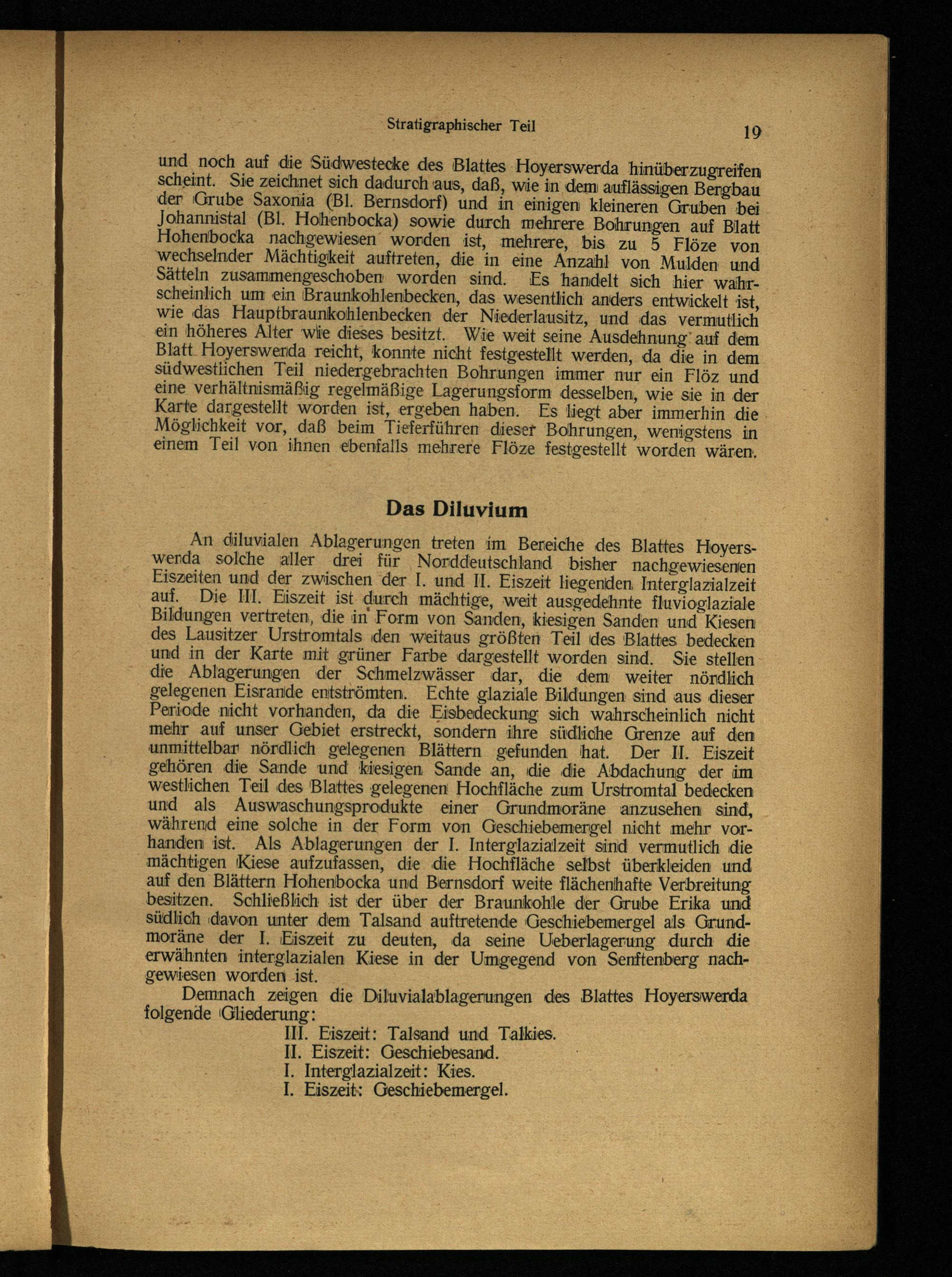 An diluvialen Ablagerungen treten im Bereiche des Blattes Hoyers werda solche aller drei für Norddeutschland bisher nachgewiesenfen Eiszeiten und der zwischen der I. und II. Eiszeit liegenden, Interglazialzeit auf. Die III. Eiszeit ist durch mächtige, weit ausgedehnte fluvioglaziale Bildungen vertreten, die in Form von Sanden , kiesigen Sanden und Kiesen des Lausitzer Urstromtals den weitaus größten Teil des Blattes bedecken und in der Karte mit grüner Farbe dargestellt worden sind. Sie stellen die Ablagerungen der Schmelzwässer dar, die dem weiter nördlich gelegenen Eisrande entströmten. Echte glaziale Bildungen sind aus dieser Periode nicht vorhanden, da die Eisbeideckung sich wahrscheinlich nicht mehr auf unser Gebiet erstreckt, sondern ihre südliche Grenze auf den unmittelbar nördlich gelegenen Blättern gefunden hat. Der II. Eiszeit gehören die Sande und kiesigen Sande an, die die Abdachung der im westlichen Teil des Blattes gelegenen Hochfläche zum Urstromtal bedecken und als Auswaschungsprodukte einer Grundmoräne anzusehen sind, während eine solche in der Form von Geschiebemergel nicht mehr vorhanden ist. Als Ablagerungen der I. Interglazialzeit sind vermutlich die mächtigen Kiese aufzufassen, die die Hochfläche selbst überkleiden und auf den Blättern Hohenbocka und Bernsdorf weite flächenhafte Verbreitung besitzen. Schließlich ist der über der Braunkohle der Grube Erika und südlich davon unter dem Talsand auftretende Geschiebemergel als Grundmoräne der I. Eiszeit zu deuten, da seine Ueberlagerung durch die erwähnten interglazialen Kiese in der Umgegend von Senftenberg nachgewiesen worden ist.