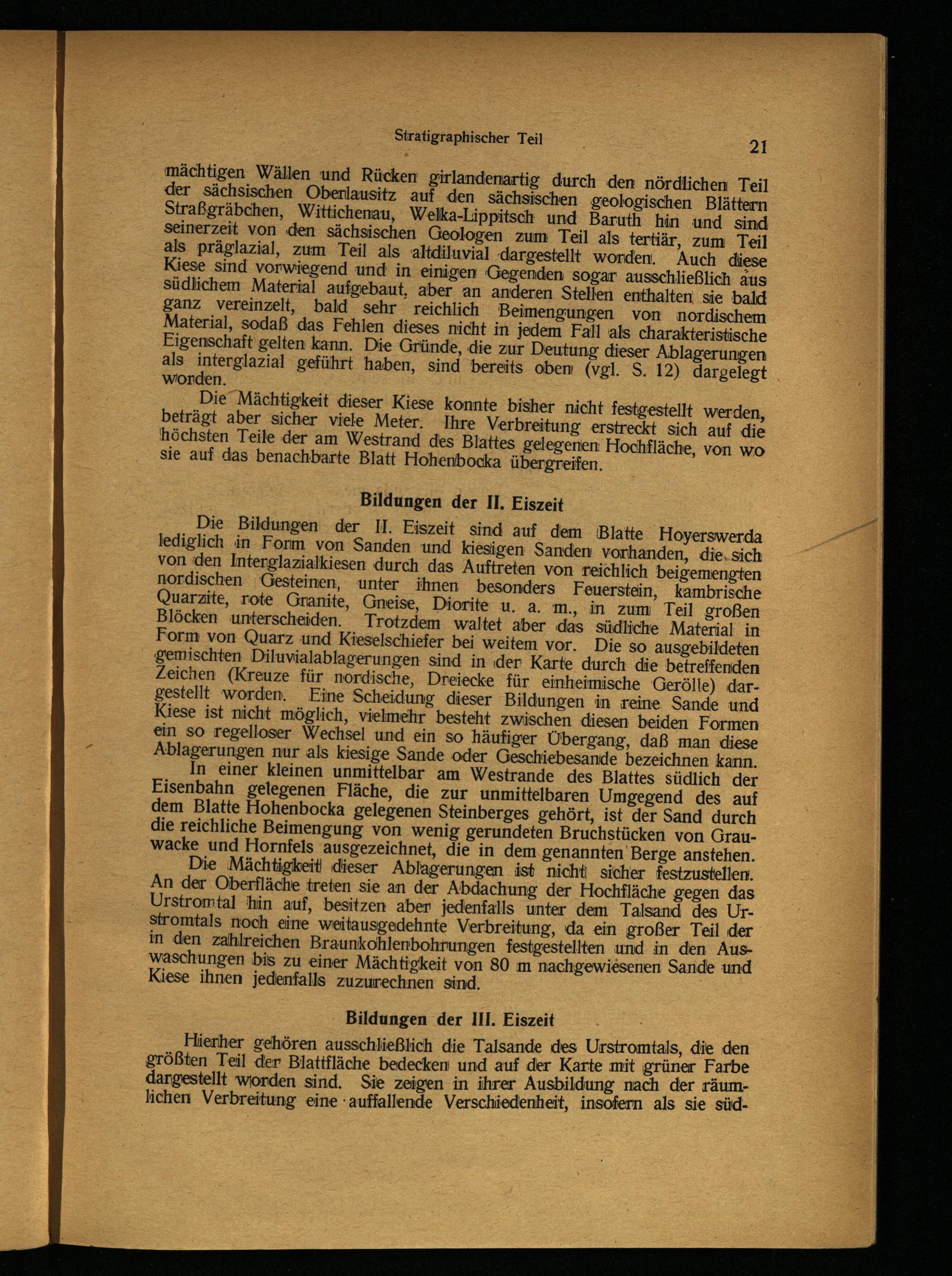 Die Mächtigkeit dieser Kiese konnte bisher nicht festgestellt werden, beträgt aber sicher viele Meter. Ihre Verbreitung erstreckt sich auf die höchsten Teile der am Westrand des Blattes gelegenen Hochfläche, von wo sie auf das benachbarte Blatt Hohenbocka übergreifen.