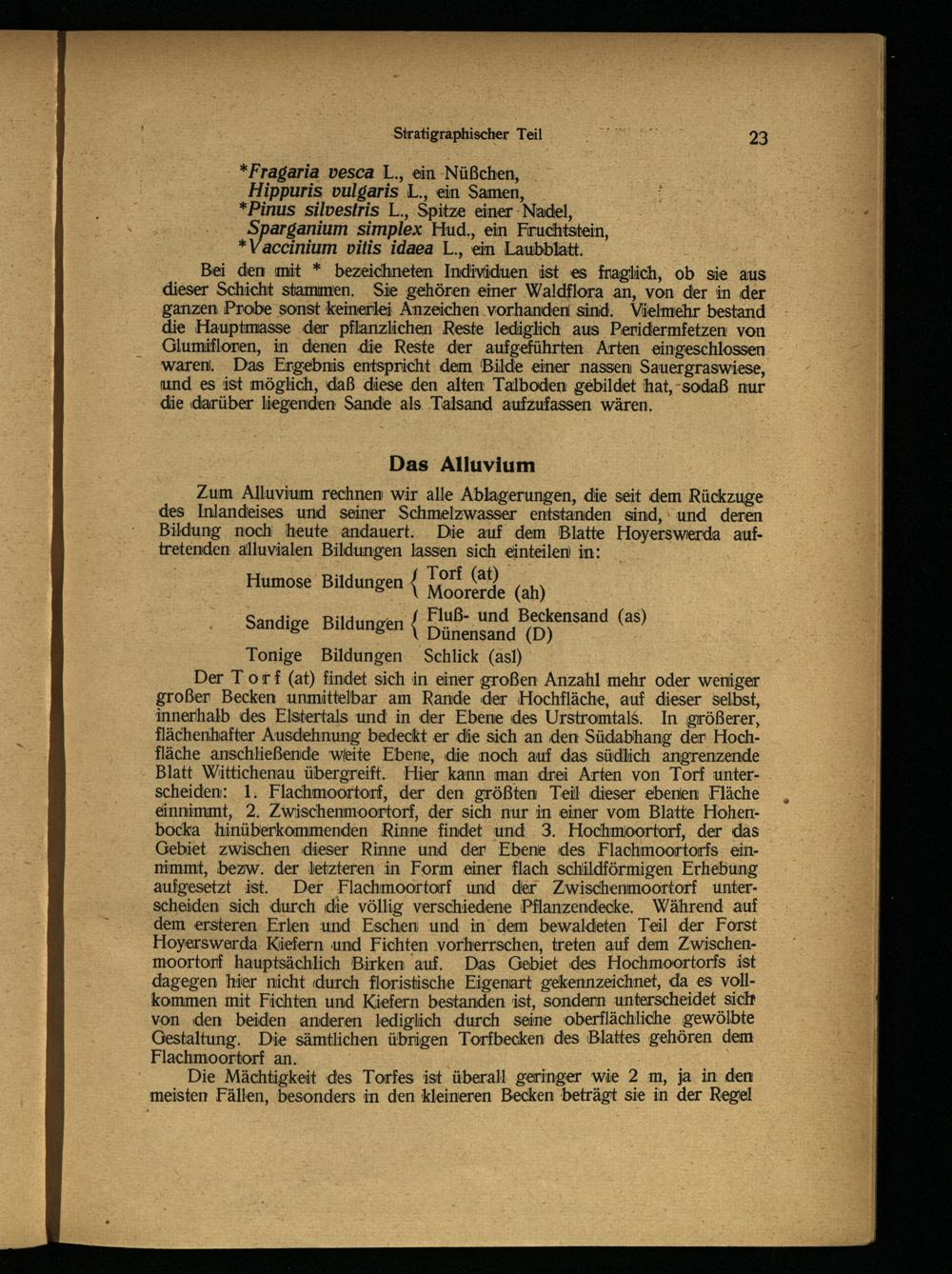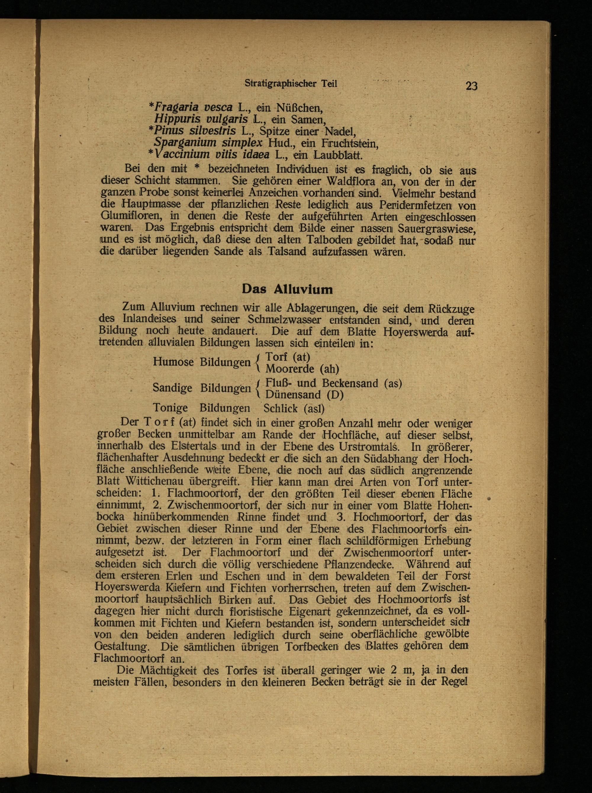 Der Torf (at) findet sich in einer großen Anzahl mehr oder weniger großer Becken unmittelbar am Rande der Hochfläche, auf dieser selbst, innerhalb des Elstertals und in der Ebene des Urstromtals . In größerer, flächenhafter Ausdehnung bedeckt er die sich an den Südabhang der Hochfläche anschließende weite Ebene, die noch auf das südlich angrenzende Blatt Wittichenau übergreift. Hier kann man drei Arten von Torf unterscheiden: 1. Flachmoortorf, der den größten Teil dieser ebenen Fläche eännimmt, 2. Zwischenmoortorf, der sich nur in einer vom Blatte Hohen- bocka hinüberkommenden Rinne findet und 3. Hochmoortorf, der das Gebiet zwischen dieser Rinne und der Ebene des Flachmoortorfs einnimmt, bezw. der letzteren in Form einer flach schildförmigen Erhebung aufgesetzt ist. Der Flachmoortorf und der Zwischenmoortorf unterscheiden sich durch die völlig verschiedene Pflanzendecke. Während auf dem ersteren Erlen und Eschen und in dem bewaldeten Teil der Forst Hoyerswerda Kiefern und Fichten vorherrschen, treten auf dem Zwischen- moortorf hauptsächlich Birken auf. Das Gebiet des Hochmoortorfs ist dagegen hier nicht durch floristische Eigenart gekennzeichnet, da es vollkommen mit Fichten und Kiefern bestanden ist, sondern unterscheidet sich von den beiden anderen lediglich durch seine oberflächliche gewölbte Gestaltung. Die sämtlichen übrigen Torfbecken des Blattes gehören dem Flachmoortorf an.