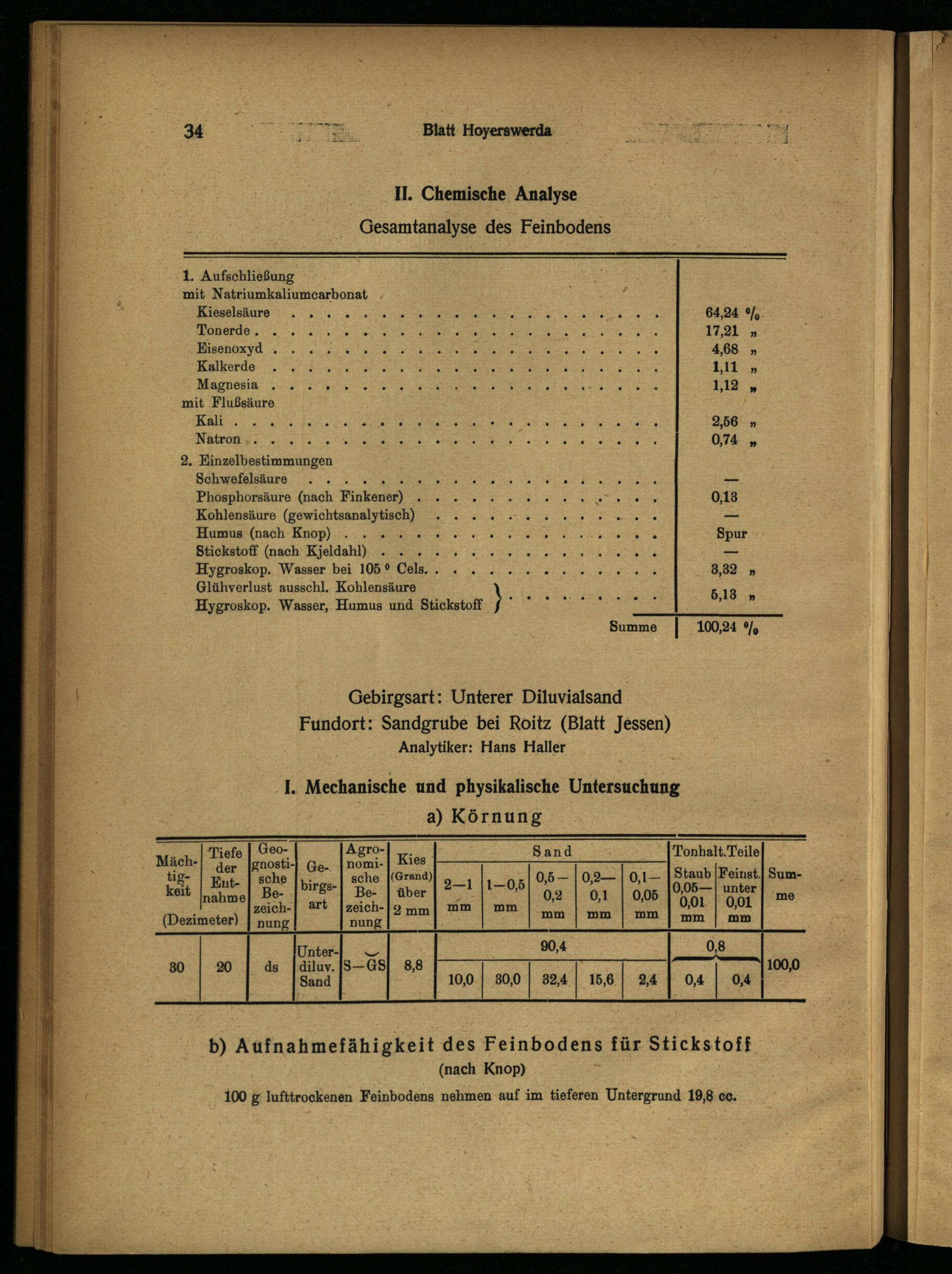 Gebirgsart: Unterer Diluvialsand Fundort: Sandgrube bei Roitz (Blatt Jessen) Analytiker: Hans Haller