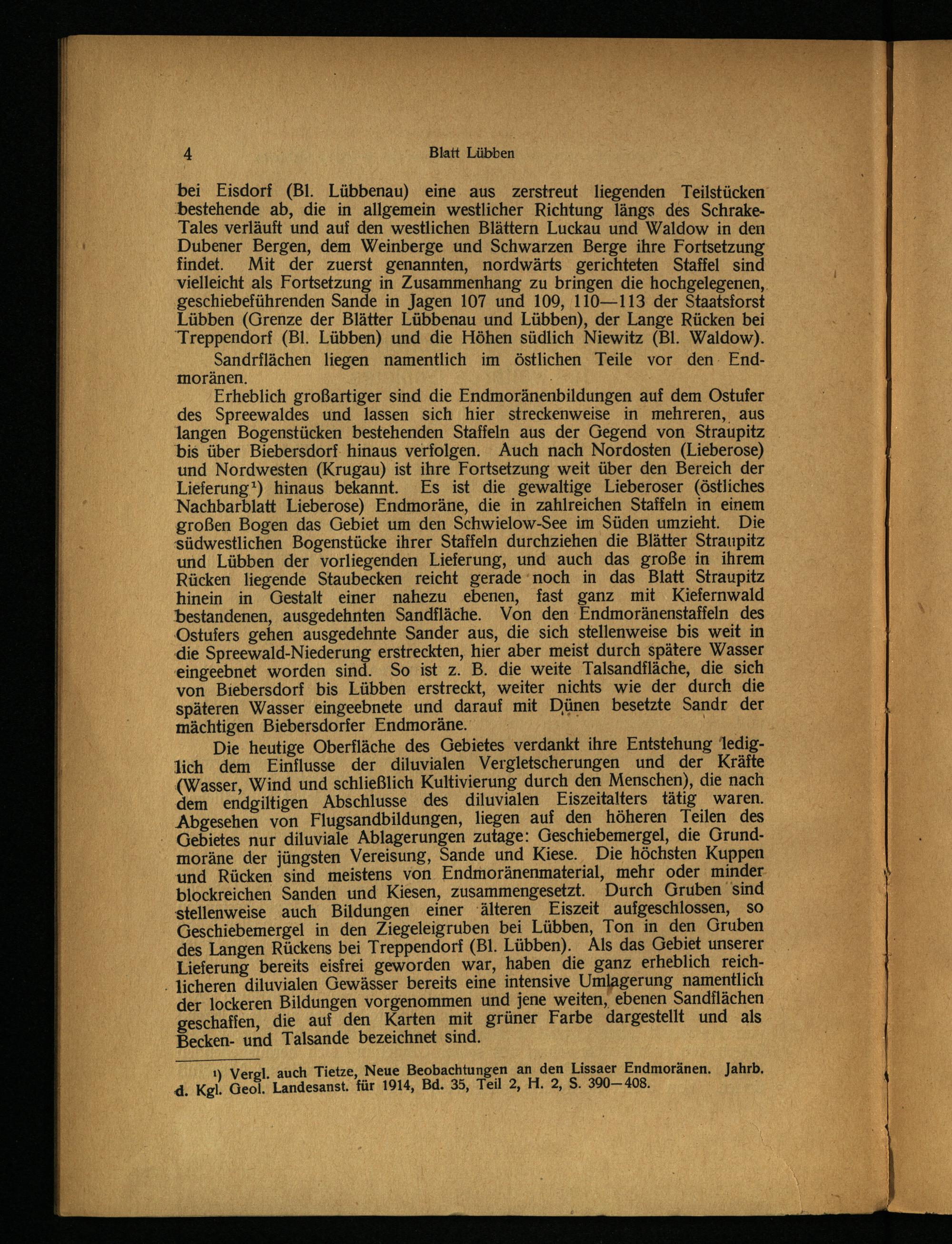Die heutige Oberfläche des Gebietes verdankt ihre Entstehung lediglich dem Einflusse der diluvialen Vergletscherungen und der Kräfte (Wasser, Wind und schließlich Kultivierung durch den Menschen), die nach dem endgiltigen Abschlusse des diluvialen Eiszeitalters tätig waren. Abgesehen von Flugsandbildungen, liegen auf den höheren Teilen des Gebietes nur diluviale Ablagerungen zutage: Geschiebemergel, die Grundmoräne der jüngsten Vereisung, Sande und Kiese . Die höchsten Kuppen und Rücken sind meistens von Endmoränenmaterial, mehr oder minder blockreichen Sanden und Kiesen, zusammengesetzt. Durch Gruben sind stellenweise auch Bildungen einer älteren Eiszeit aufgeschlossen, so Geschiebemergel in den Ziegeleigruben bei Lübben , Ton in den Gruben des Langen Rückens bei Treppendorf (Bl. Lübben). Als das Gebiet unserer Lieferung bereits eisfrei geworden war, haben die ganz erheblich reichlicheren diluvialen Gewässer bereits eine intensive Umlagerung namentlich der lockeren Bildungen vorgenommen und jene weiten, ebenen Sandflächen geschaffen, die auf den Karten mit grüner Farbe dargestellt und als Becken- und Talsande bezeichnet sind.