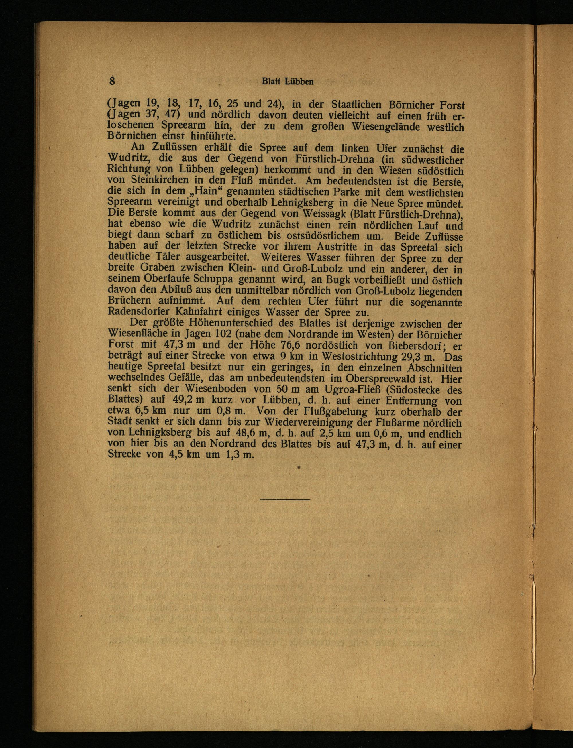 Der größte Höhenunterschied des Blattes ist derjenige zwischen der Wiesenfläche in Jagen 102 (nahe dem Nordrande im Westen) der Börnicher Forst mit 47,3 m und der Höhe 76,6 nordöstlich von Biebersdorf; er beträgt auf einer Strecke von etwa 9 km in Westostrichtung 29,3 m. Das heutige Spreetal besitzt nur ein geringes, in den einzelnen Abschnitten wechselndes Gefälle, das am unbedeutendsten im Oberspreewald ist. Hier senkt sich der Wiesenboden von 50 m am Ugroa-Fließ (Südostecke des Blattes) auf 49,2 m kurz vor Lübben , d. h. auf einer Entfernung von etwa 6,5 km nur um 0,8 m. Von der Flußgabelung kurz oberhalb der Stadt senkt er sich dann bis zur Wiedervereinigung der Flußarme nördlich von Lehnigksberg bis auf 48,6 m, d. h. auf 2,5 km um 0,6 m, und endlich von hier bis an den Nordrand des Blattes bis auf 47,3 m, d. h. auf einer Strecke von 4,5 km um 1,3 m.
