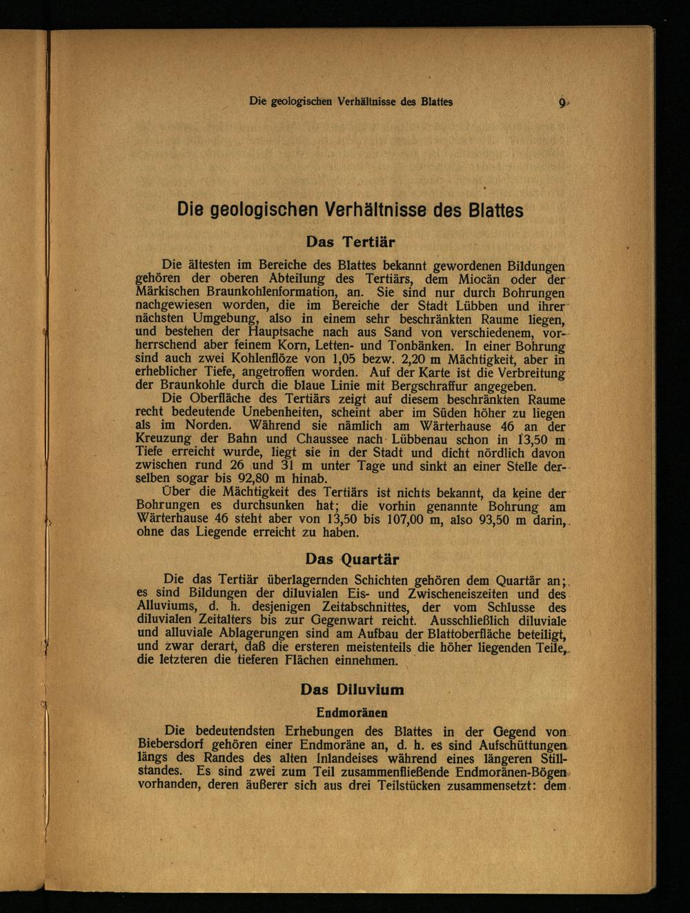 Die ältesten im Bereiche des Blattes bekannt gewordenen Bildungen gehören der oberen Abteilung des Tertiärs, dem Miocän oder der Märkischen Braunkohlenformation, an. Sie sind nur durch Bohrungen nachgewiesen worden, die im Bereiche der Stadt Lübben und ihrer nächsten Umgebung, also in einem sehr beschränkten Raume liegen, und bestehen der Hauptsache nach aus Sand von verschiedenem, vorherrschend aber feinem Korn, Letten- und Tonbänken. In einer Bohrung sind auch zwei Kohlenflöze von 1,05 bezw. 2,20 m Mächtigkeit, aber in erheblicher Tiefe, angetroffen worden. Auf der Karte ist die Verbreitung der Braunkohle durch die blaue Linie mit Bergschraffur angegeben.