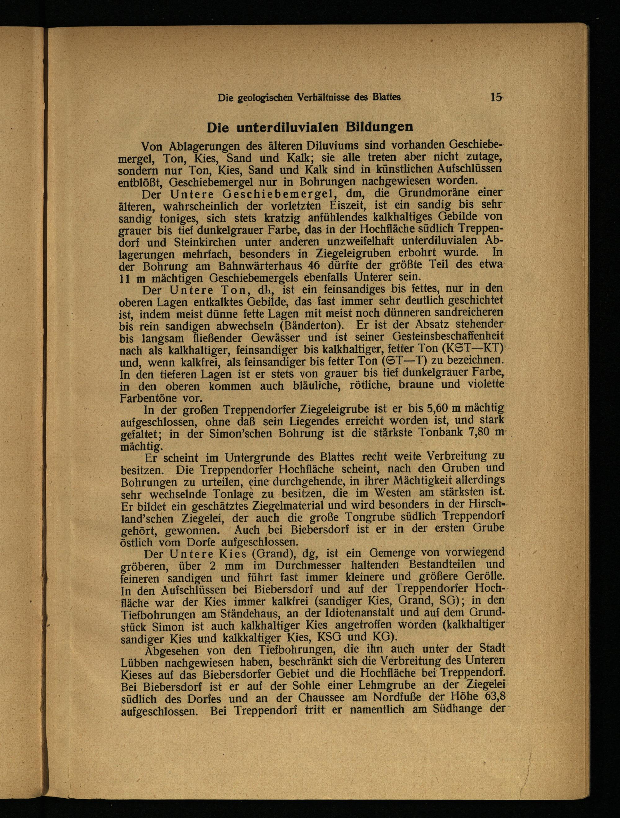 Der Untere Geschiebemergel, dm, die Grundmoräne einer älteren, wahrscheinlich der vorletzten Eiszeit, ist ein sandig bis sehr sandig toniges, sich stets kratzig anfühlendes kalkhaltiges Gebilde von grauer bis tief dunkelgrauer Farbe, das in der Hochfläche südlich Treppendorf und Steinkirchen unter anderen unzweifelhaft unterdiluvialen Ablagerungen mehrfach, besonders in Ziegeleigruben erbohrt wurde. In der Bohrung am Bahnwärterhaus 46 dürfte der größte Teil des etwa 11 m mächtigen Geschiebemergels ebenfalls Unterer sein.