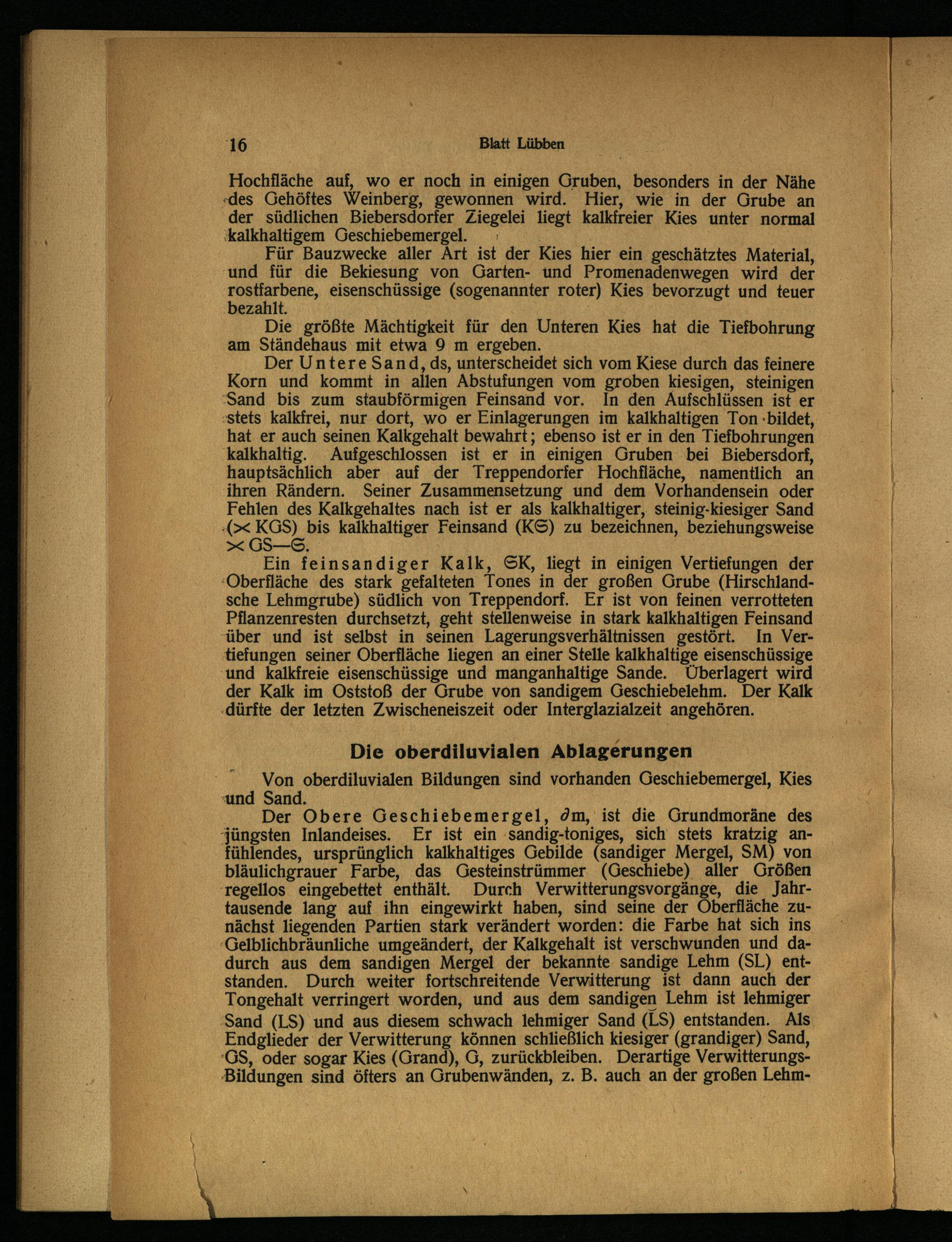 Der Obere Geschiebemergel, dm, ist die Grundmoräne des jüngsten Inlandeises. Er ist ein sandig-toniges, sich stets kratzig anfühlendes, ursprünglich kalkhaltiges Gebilde (sandiger Mergel, SM) von bläulichgrauer Farbe, das Gesteinstrümmer (Geschiebe) aller Größen regellos eingebettet enthält. Durch Verwitterungsvorgänge, die Jahrtausende lang auf ihn eingewirkt haben, sind seine der Oberfläche zunächst liegenden Partien stark verändert worden: die Farbe hat sich ins Gelblichbräunliche umgeändert, der Kalkgehalt ist verschwunden und dadurch aus dem sandigen Mergel der bekannte sandige Lehm (SL) entstanden. Durch weiter fortschreitende Verwitterung ist dann auch der Tongehalt verringert worden, und aus dem sandigen Lehm ist lehmiger Sand (LS) und aus diesem schwach lehmiger Sand (LS) entstanden. Als Endglieder der Verwitterung können schließlich kiesiger (grandiger) Sand, GS, oder sogar Kies (Grand), G, Zurückbleiben. Derartige Verwitterungs- Bildungen sind öfters an Grubenwänden, z. B. auch an der großen Lehm-