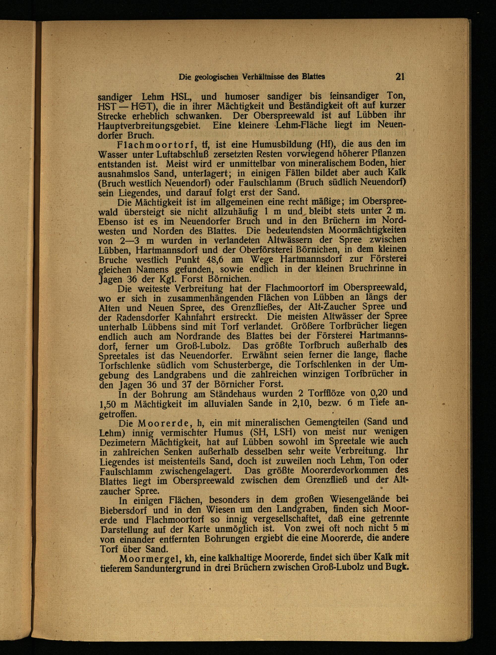 Die Mächtigkeit ist im allgemeinen eine recht mäßige; im Oberspree wald übersteigt sie nicht allzuhäufig 1 m und. bleibt stets unter 2 m. Ebenso ist es im Neuendorfer Bruch und in den Brüchem im Nordwesten und Norden des Blattes. Die bedeutendsten Moormächtigkeiten von 2—3 m wurden in verlandeten Altwässern der Spree zwischen Lübben , Hartmannsdorf und der Oberförsterei Börnichen, in dem kleinen Bruche westlich Punkt 48,6 am Wege Hartmannsdorf zur Försterei gleichen Namens gefunden, sowie endlich in der kleinen Bruchrinne in Jagen 36 der Kgl. Forst Börnichen.