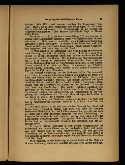 Die Moorerde, h, ein mit mineralischen Gemengteilen (Sand und Lehm) innig vermischter Humus (SH, LSH) von meist nur wenigen Dezimetern Mächtigkeit, hat auf Lübben sowohl im Spreetale wie auch in zahlreichen Senken außerhalb desselben sehr weite Verbreitung. Ihr Liegendes ist meistenteils Sand, doch ist zuweilen noch Lehm, Ton oder Faulschlamm zwischengelagert. Das größte Moorerdevorkommen des Blattes liegt im Oberspreewald zwischen dem Grenzfließ und der Alt- zaucher Spree.
