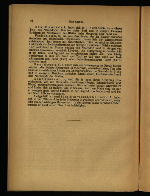 Aufgefüllter und künstlich veränderter Boden, A, findet sich in der Nähe und in jeder Siedelung in größeren oder kleineren, mehr oder minder mächtigen Massen vor. In den älteren Teilen der Stadt Lübben erreicht er nicht selten über 1 m Mächtigkeit.