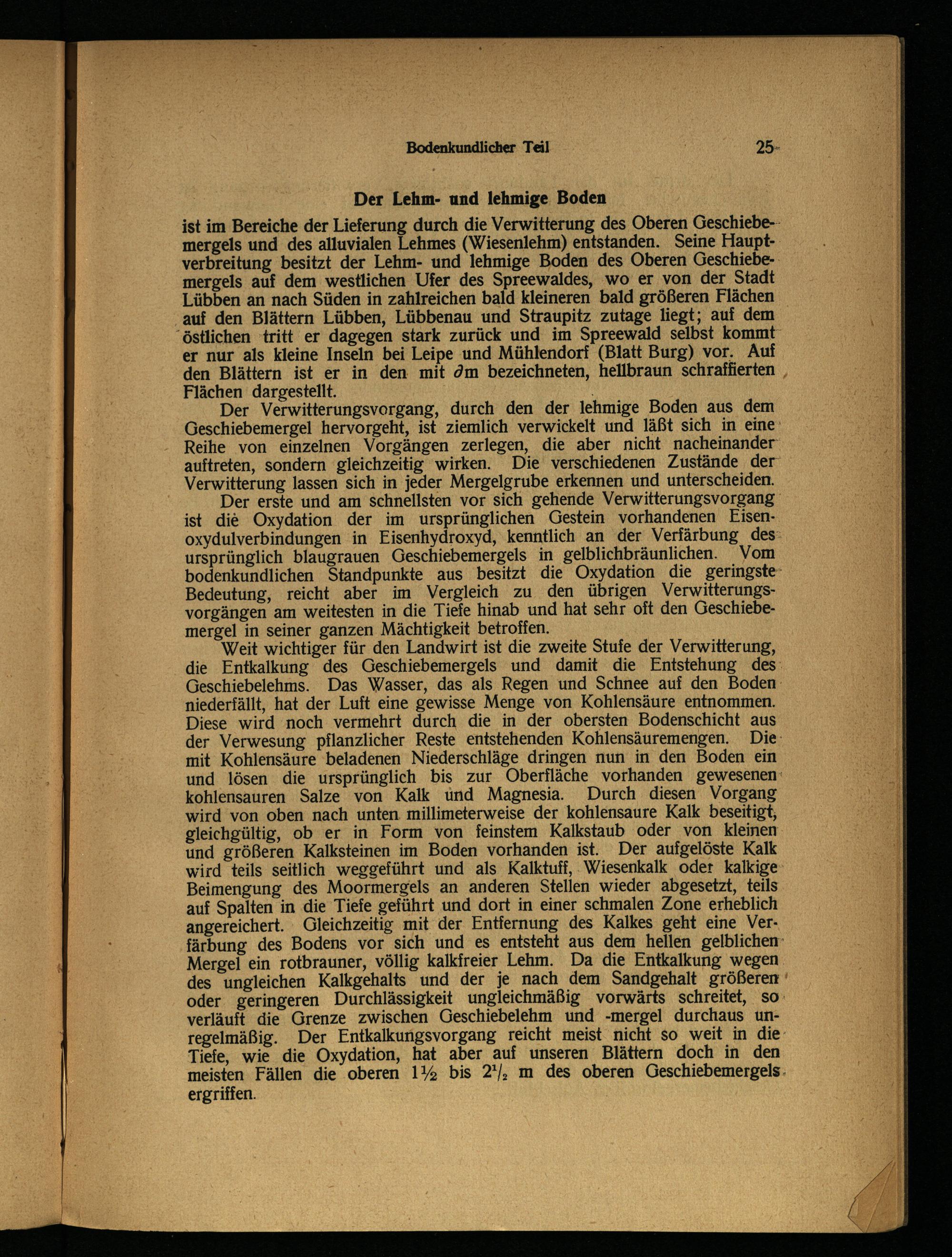 ist im Bereiche der Lieferung durch die Verwitterung des Oberen Geschiebemergels und des alluvialen Lehmes (Wiesenlehm) entstanden. Seine Hauptverbreitung besitzt der Lehm- und lehmige Boden des Oberen Geschiebemergels auf dem westlichen Ufer des Spreewaldes, wo er von der Stadt Lübben an nach Süden in zahlreichen bald kleineren bald größeren Flächen auf den Blättern Lübben , Lübbenau und Straupitz zutage liegt; auf dem östlichen tritt er dagegen stark zurück und im Spreewald selbst kommt er nur als kleine Inseln bei Leipe und Mühlendorf (Blatt Burg) vor. Auf den Blättern ist er in den mit dm bezeichneten, hellbraun schraffierten Flächen dargestellt.