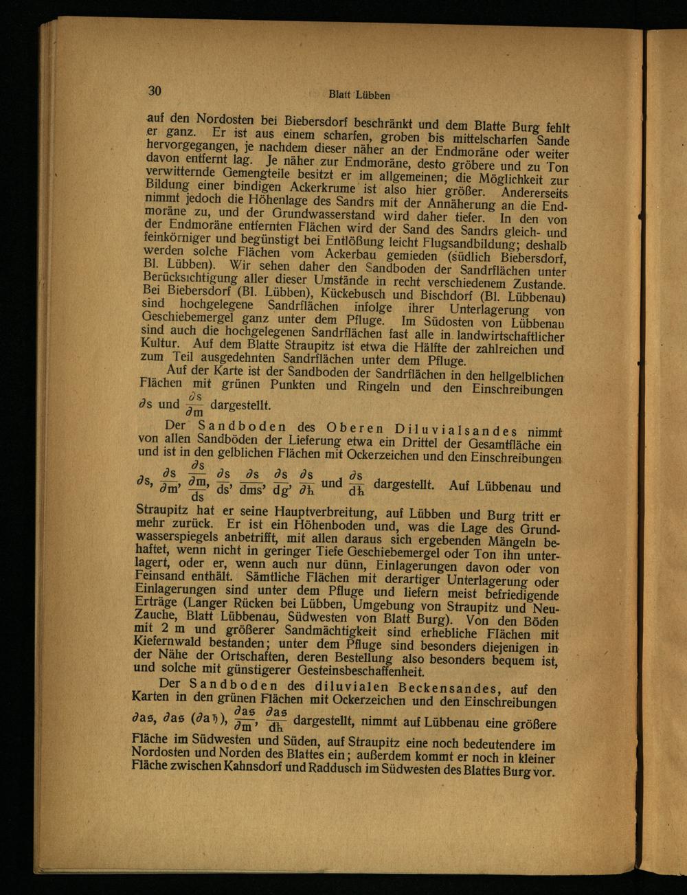 Straupitz hat er seine Hauptverbreitung, auf Lübben und Burg tritt er mehr zurück. Er ist ein Höhenboden und, was die Lage des Grundwasserspiegels anbetrifft, mit allen daraus sich ergebenden Mängeln behaftet, wenn nicht in geringer Tiefe Geschiebemergel oder Ton ihn unterlagert, oder er, wenn auch nur dünn, Einlagerungen davon oder von Feinsand enthält. Sämtliche Flächen mit derartiger Unterlagerung oder Einlagerungen sind unter dem Pfluge und liefern meist befriedigende Erträge (Langer Rücken bei Lübben , Umgebung von Straupitz und Neu- Zauche, Blatt Lübbenau , Südwesten von Blatt Burg). Von den Böden mit 2 m und größerer Sandmächtigkeit sind erhebliche Flächen mit Kiefernwald bestanden; unter dem Pfluge sind besonders diejenigen in der Nähe der Ortschaften, deren Bestellung also besonders bequem ist, und solche mit günstigerer Gesteinsbeschaffenheit.