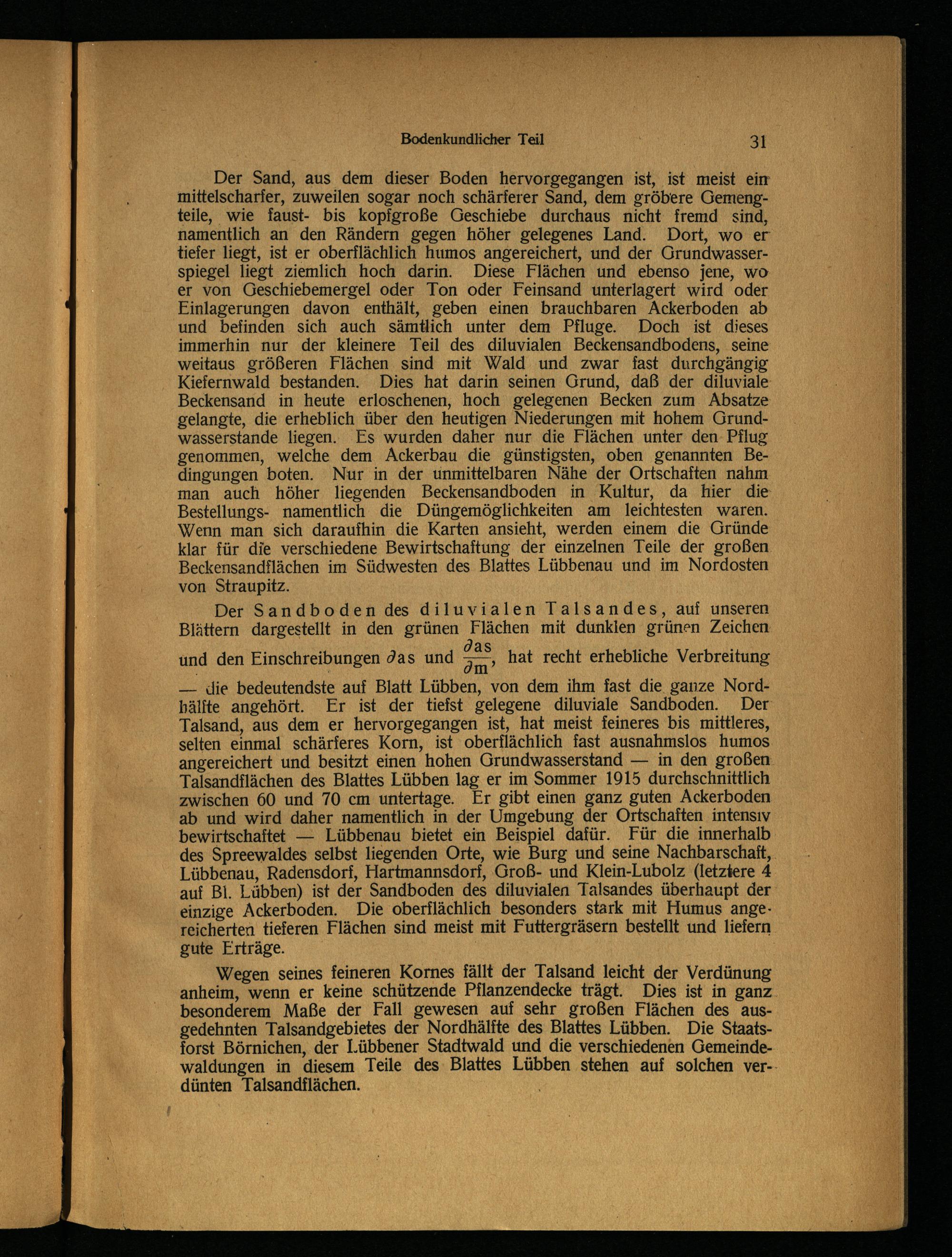 — die bedeutendste auf Blatt Lübben , von dem ihm fast die ganze Nord- bälfte angehört. Er ist der tiefst gelegene diluviale Sandboden. Der Talsand, aus dem er hervorgegangen ist, hat meist feineres bis mittleres, selten einmal schärferes Korn, ist oberflächlich fast ausnahmslos humos angereichert und besitzt einen hohen Grundwasserstand — in den großen Talsandflächen des Blattes Lübben lag er im Sommer 1915 durchschnittlich zwischen 60 und 70 cm untertage. Er gibt einen ganz guten Ackerboden ab und wird daher namentlich in der Umgebung der Ortschaften intensiv bewirtschaftet — Lübbenau bietet ein Beispiel dafür. Für die innerhalb des Spreewaldes selbst liegenden Orte, wie Burg und seine Nachbarschaft, Lübbenau , Radensdorf, Hartmannsdorf, Groß- und Klein-Lubolz (letztere 4 auf Bl. Lübben) ist der Sandboden des diluvialen Talsandes überhaupt der einzige Ackerboden. Die oberflächlich besonders stark mit Humus ange- reicherten tieferen Flächen sind meist mit Futtergräsern bestellt und liefern gute Erträge.