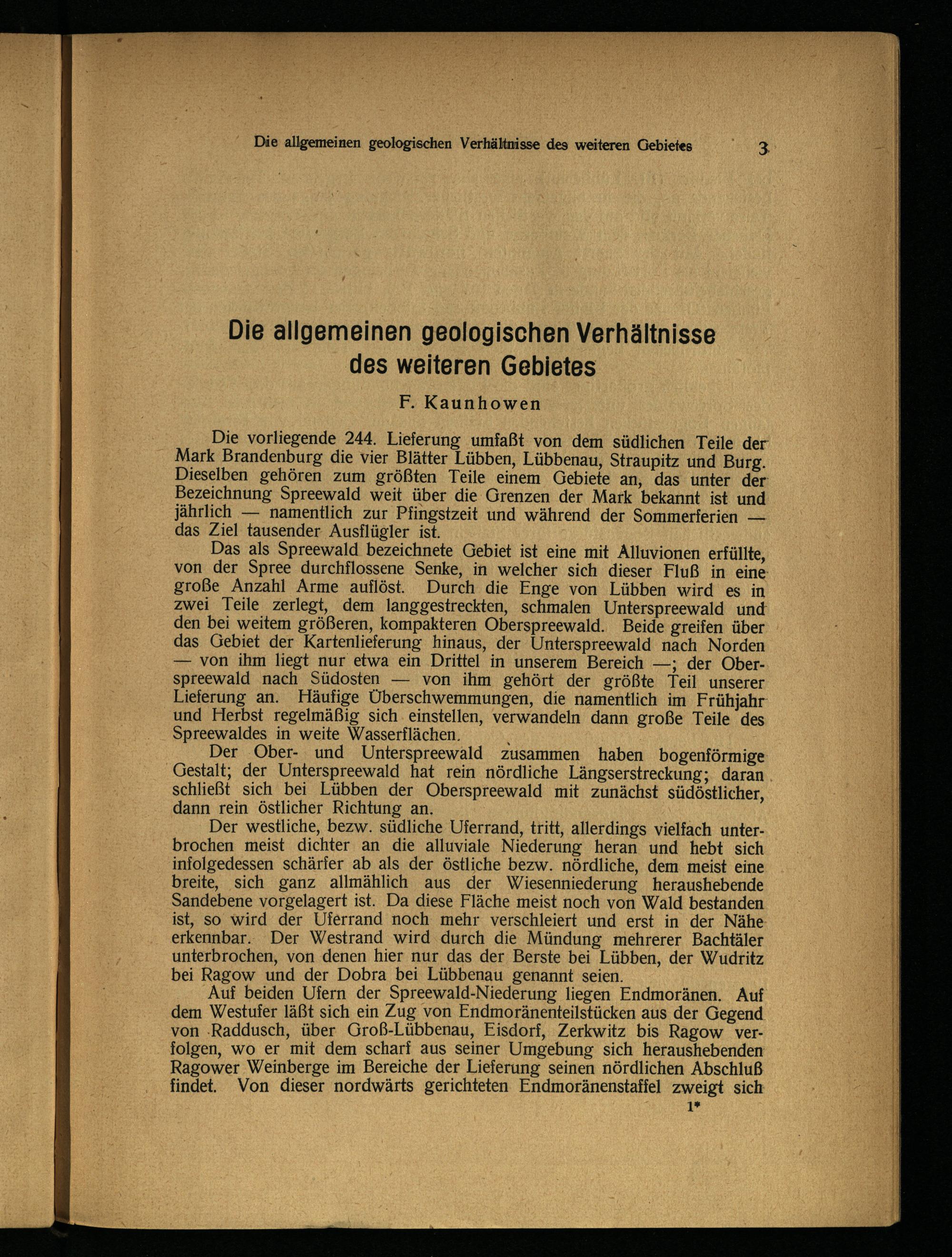 Die vorliegende 244. Lieferung umfaßt von dem südlichen Teile der Mark Brandenburg die vier Blätter Lübben , Lübbenau , Straupitz und Burg. Dieselben gehören zum größten Teile einem Gebiete an, das unter der Bezeichnung Spreewald weit über die Grenzen der Mark bekannt ist und jährlich — namentlich zur Pfingstzeit und während der Sommerferien — das Ziel tausender Ausflügler ist.