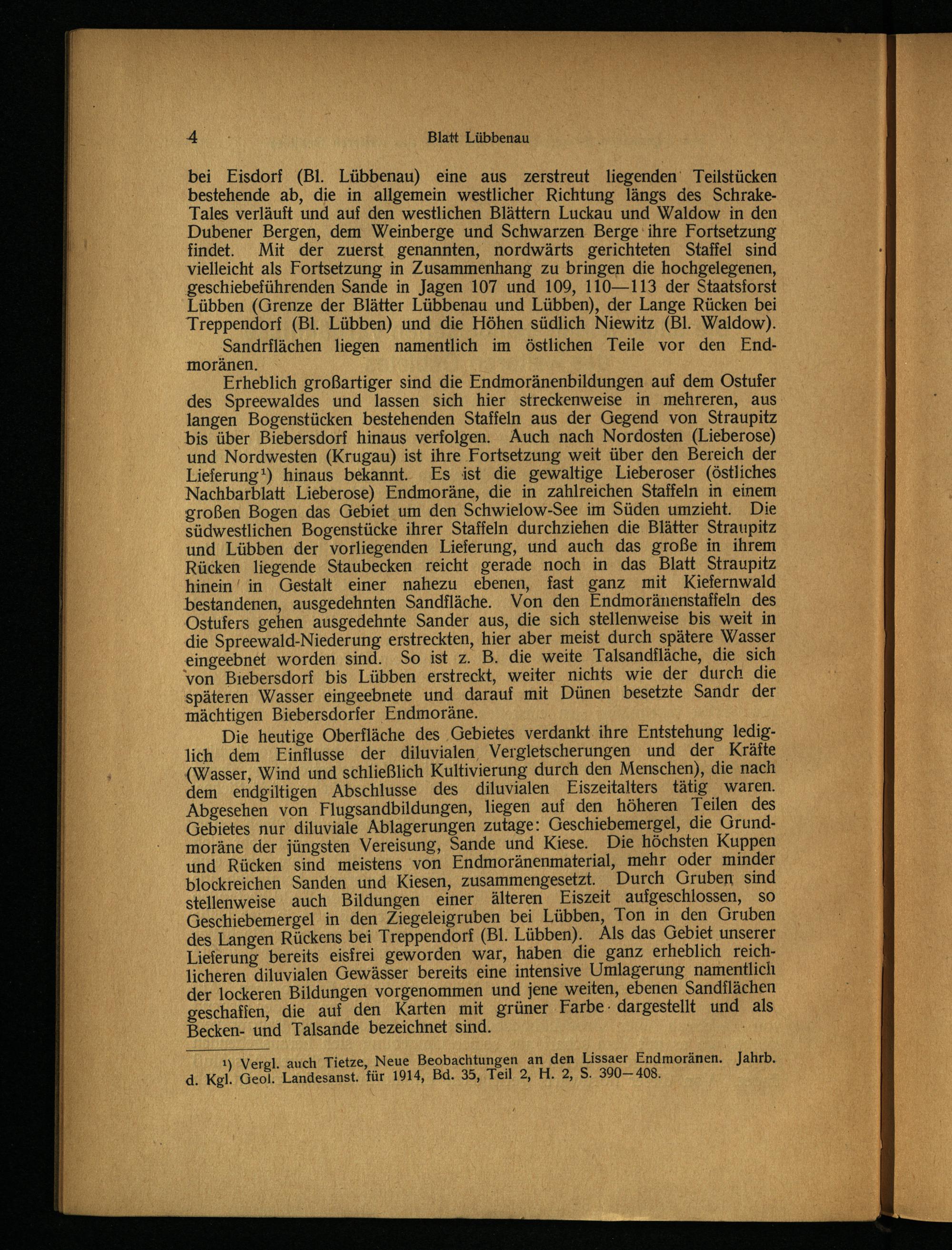 Erheblich großartiger sind die Endmoränenbildungen auf dem Ostufer des Spreewaldes und lassen sich hier streckenweise in mehreren, aus langen Bogenstücken bestehenden Staffeln aus der Gegend von Straupitz bis über Biebersdorf hinaus verfolgen. Auch nach Nordosten (Lieberose ) und Nordwesten (Krugau) ist ihre Fortsetzung weit über den Bereich der Lieferung 1 ) hinaus bekannt. Es ist die gewaltige Lieberoser (östliches Nachbarblatt Lieberose ) Endmoräne, die in zahlreichen Staffeln in einem großen Bogen das Gebiet um den Schwielow-See im Süden umzieht. Die südwestlichen Bogenstücke ihrer Staffeln durchziehen die Blätter Straupitz und Lübben der vorliegenden Lieferung, und auch das große in ihrem Rücken liegende Staubecken reicht gerade noch in das Blatt Straupitz hinein in Gestalt einer nahezu ebenen, fast ganz mit Kiefernwald bestandenen, ausgedehnten Sandfläche. Von den Endmoränenstaffeln des Ostufers gehen ausgedehnte Sander aus, die sich stellenweise bis weit in die Spreewald-Niederung erstreckten, hier aber meist durch spätere Wasser eingeebnet worden sind. So ist z. B. die weite Talsandfläche, die sich von Biebersdorf bis Lübben erstreckt, weiter nichts wie der durch die späteren Wasser eingeebnete und darauf mit Dünen besetzte Sandr der mächtigen Biebersdorfer Endmoräne.