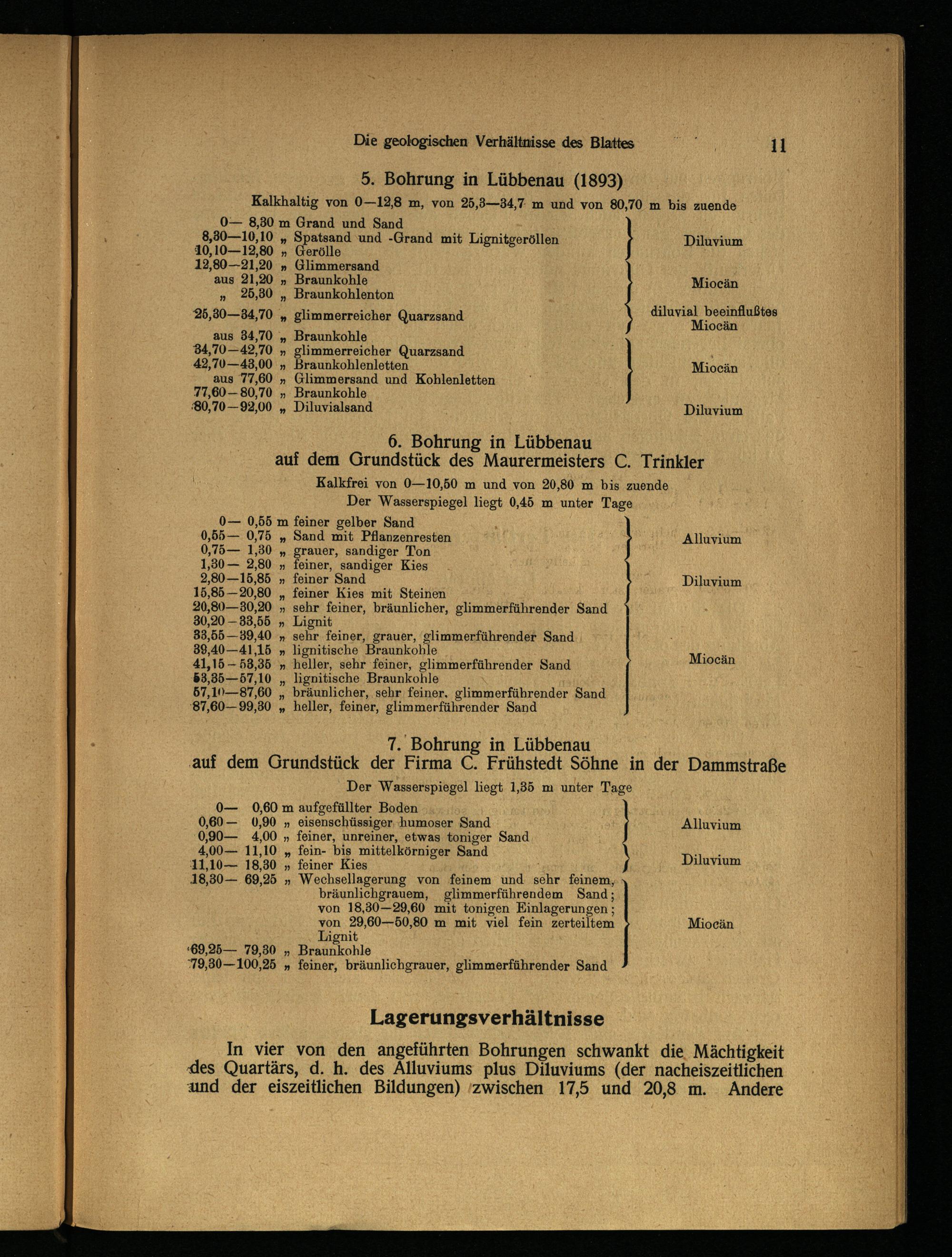 0— 8,30 m Grand und Sand 8,30—10,10 „ Spatsand und -Grand mit Lignitgeröllen 10,10-12,80 „ Gerölle 12,80—21,20 „ Glimmersand aus 21,20 „ Braunkohle „ 25,30 „ Braunkohlenton