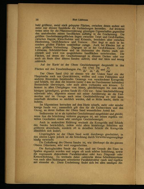 Im Allgemeinen herrschen auf dem Blatte scharfe, mehr oder minder kiesige Sande vor; namentlich gilt dies für die Endmoränen und den Oszug, an deren Aufbau der Obere Sand wesentlichen Anteil hat.