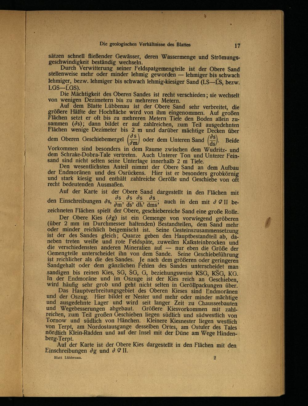 Auf dem Blatte Lübbenau ist der Obere Sand sehr verbreitet, die größere Hälfte der Hochfläche wird von ihm eingenommen. Auf großen Flächen setzt er oft bis zu mehreren Metern Tiefe den Boden allein zusammen (<?s); dann bildet er auf zahlreichen, zum Teil ausgedehnten Flächen wenige Dezimeter bis 2 m und darüber mächtige Decken über