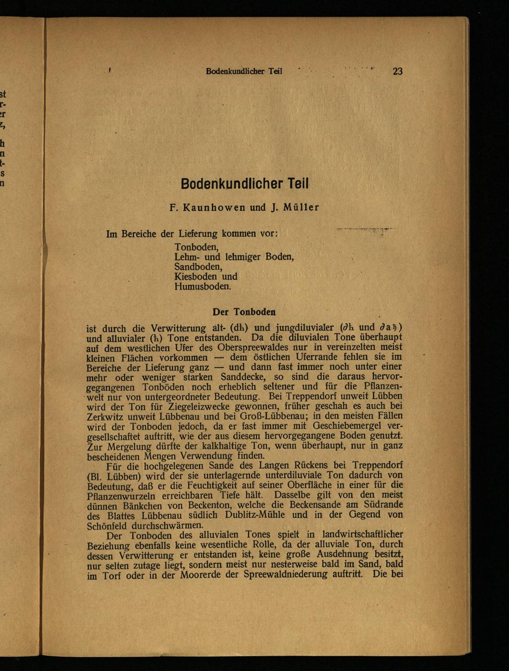 ist durch die Verwitterung alt- (dh) und jungdiluvialer (dh. und dat>) und alluvialer (L) Tone entstanden. Da die diluvialen Tone überhaupt auf dem westlichen Ufer des Oberspreewaldes nur in vereinzelten meist kleinen Flächen Vorkommen — dem östlichen Uferrande fehlen sie im Bereiche der Lieferung ganz — und dann fast immer noch unter einer mehr oder weniger starken Sanddecke, so sind die daraus hervorgegangenen Tonböden noch erheblich seltener und für die Pflanzenwelt nur von untergeordneter Bedeutung. Bei Treppendorf unweit Lübben wird der Ton für Ziegeleizwecke gewonnen, früher geschah es auch bei Zerkwitz unweit Lübbenau und bei Groß-Lübbenau; in den meisten Fällen wird der Tonboden jedoch, da er fast immer mit Geschiebemergel vergesellschaftet auftritt, wie der aus diesem hervorgegangene Boden genutzt. Zur Mergelung dürfte der kalkhaltige Ton, wenn überhaupt, nur in ganz bescheidenen Mengen Verwendung finden.