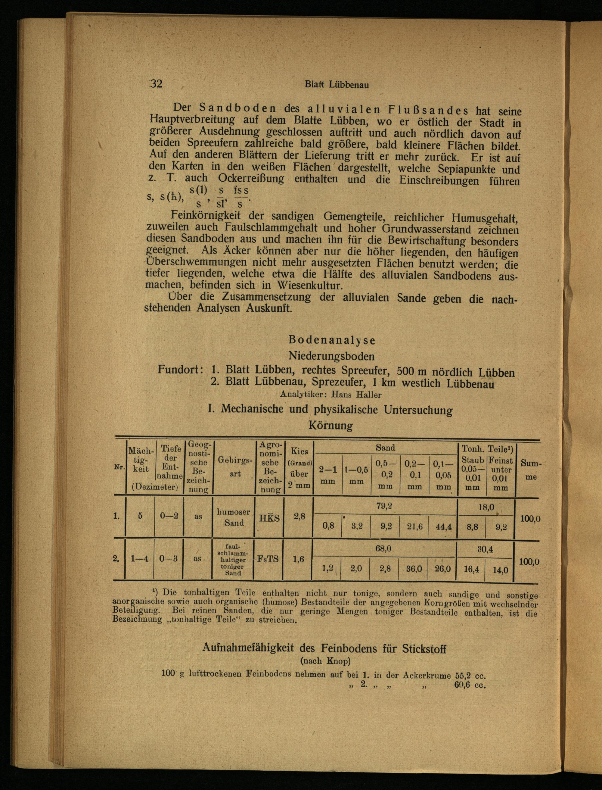 Der Sandboden des alluvialen Flußsandes hat seine Hauptverbreitung auf dem Blatte Lübben , wo er östlich der Stadt in größerer Ausdehnung geschlossen auftritt und auch nördlich davon auf beiden Spreeufern zahlreiche bald größere, bald kleinere Flächen bildet. Auf den anderen Blättern der Lieferung tritt er mehr zurück. Er ist auf den Karten in den weißen Flächen dargestellt, welche Sepiapunkte und z. T. auch Ockerreißung enthalten und die Einschreibungen führen