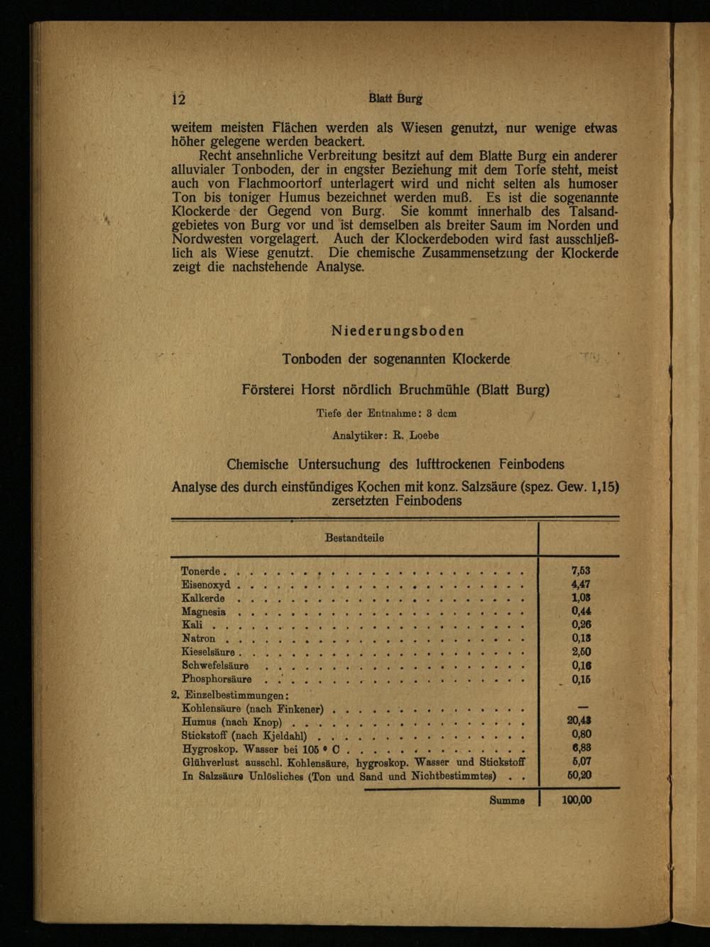 Recht ansehnliche Verbreitung besitzt auf dem Blatte Burg ein anderer alluvialer Tonboden, der in engster Beziehung mit dem Torfe steht, meist auch von Flachmoortorf unterlagert wird und nicht selten als humoser Ton bis toniger Humus bezeichnet werden muß. Es ist die sogenannte Klockerde der Gegend von Burg. Sie kommt innerhalb des Talsandgebietes von Burg vor und ist demselben als breiter Saum im Norden und Nordwesten vorgelagert. Auch der Klockerdeboden wird fast ausschließlich als Wiese genutzt. Die chemische Zusammensetzung der Klockerde zeigt die nachstehende Analyse.