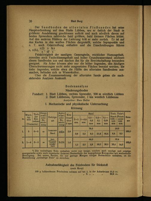 Der Sandboden des alluvialen Flußsandes hat seine Hauptverbreitung auf dem Blatte Lübben , wo er östlich der Stadt in größerer Ausdehnung geschlossen auftritt und auch nördlich davon auf beiden Spreeufern zahlreiche bald größere, bald kleinere Flächen bildet. Auf den anderen Blättern der Lieferung tritt er mehr zurück. Er ist auf den Karten in den weißen Flächen dargestellt, welche Sepiapunkte und z. T. auch Ockerreißung enthalten und die Einschreibungen führen s(l) s fss ’ s ’ sl’ s ‘