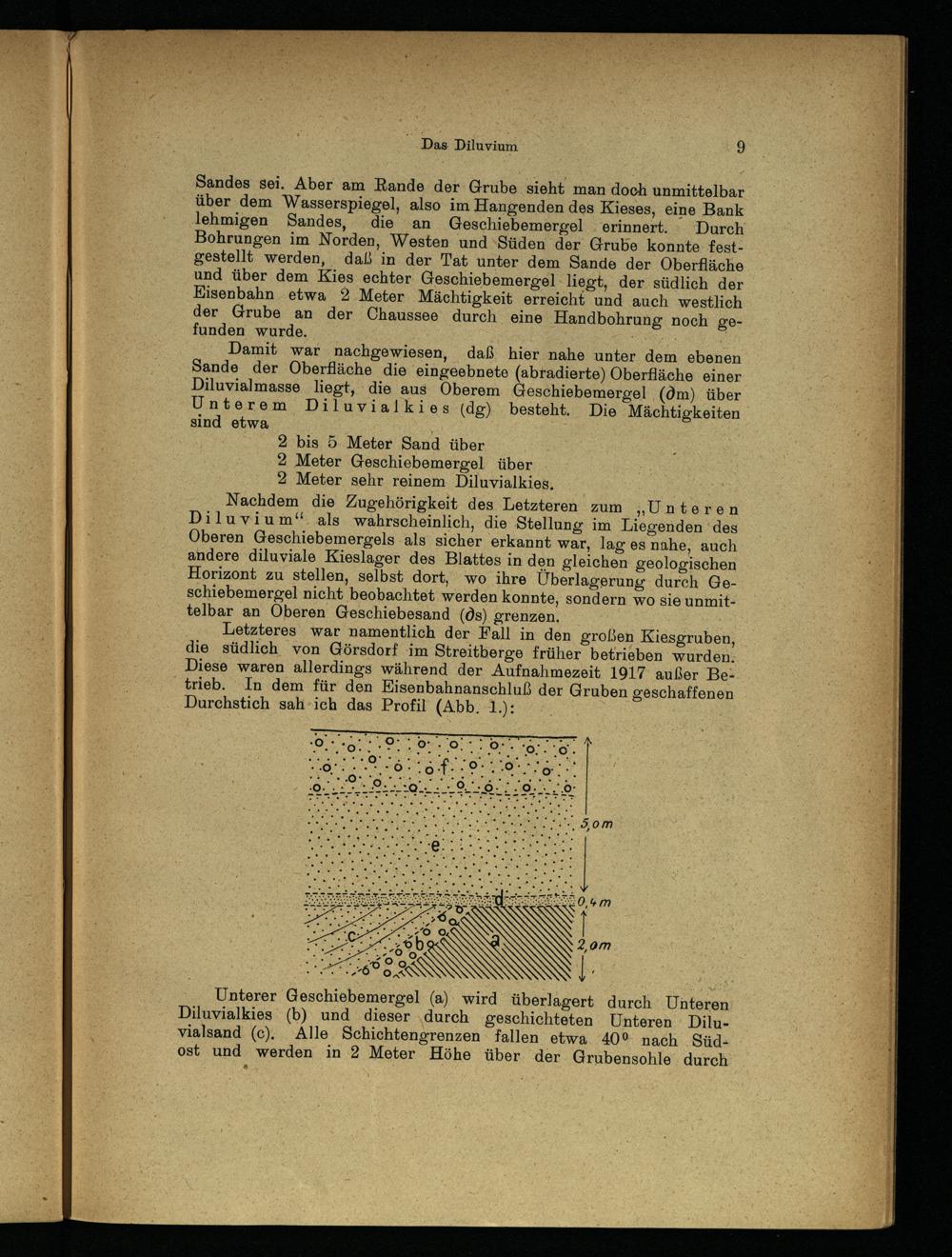 Letzteres war namentlich der Fall in den großen Kiesgruben, die südlich von Görsdorf im Streitberge früher betrieben wurden. Diese waren allerdings während der Aufnahmezeit 1917 außer Betrieb. In dem für den Eisenbahnanschluß der Gruben geschaffenen Durchstich sah ich das Profil (Abb. 1.):