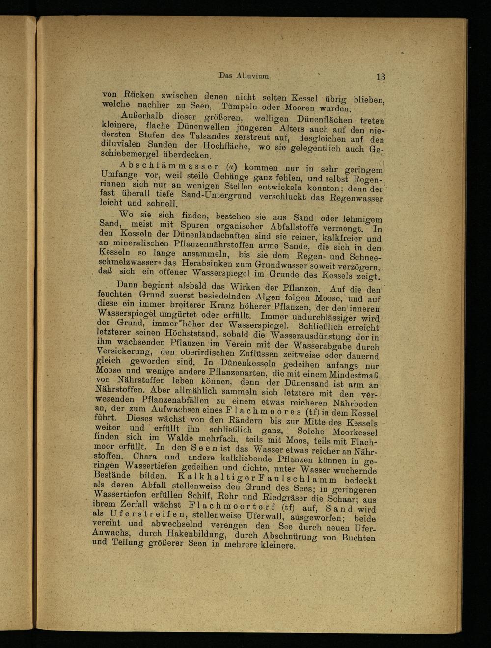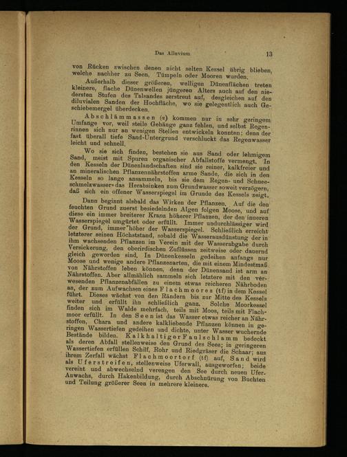 Dann beginnt alsbald das Wirken der Pflanzen. Auf die den feuchten Grund zuerst besiedelnden Algen folgen Moose, und auf diese ein immer breiterer Kranz höherer Pflanzen, der den inneren Wasserspiegel umgürtet oder erfüllt. Immer undurchlässiger wird der Grund, immer höher der Wasserspiegel. Schließlich erreicht letzterer seinen Höchststand, sobald die Wasserausdünstung der in ihm wachsenden Pflanzen im Verein mit der Wasserabgabe durch Versickerung, den oberirdischen Zuflüssen zeitweise oder dauernd gleich geworden sind. In Dünenkesseln gedeihen anfangs nur Moose und wenige andere Pflanzenarten, die mit einem Mindestmaß von Nährstoffen leben können, denn der Dünensand ist arm an Nährstoffen. Aber allmählich sammeln sich letztere mit den verwesenden Pflanzenabfällen zu einem etwas reicheren Nährboden an, der zum Aufwachsen eines Flachmoores (tf) in dem Kessel führt. Dieses wächst von den Rändern bis zur Mitte des Kessels weiter und erfüllt ihn schließlich ganz. Solche Moorkessel finden sich im Walde mehrfach, teils mit Moos, teils mit Flach- moor erfüllt. In den Seen ist das Wasser etwas reicher an Nährstoffen, Chara und andere kalkliebende Pflanzen können in geringen Wassertiefen gedeihen und dichte, unter Wasser wuchernde Bestände bilden. Kalkhaltiger Faulschlamm bedeckt als deren Abfall stellenweise den Grund des Sees; in geringeren Wassertiefen erfüllen Schilf, Rohr und Riedgräser die Schaar; aus ihrem Zerfall wächst Flachmoortorf (tf) auf, Sand wird als Uferstreifen, stellenweise Uferwall, ausgeworfen; beide vereint und abwechselnd verengen den See durch neuen Ufer- Anwachs, durch Hakenbildung, durch Abschnürung von Buchten und Teilung größerer Seen in mehrere kleinere.