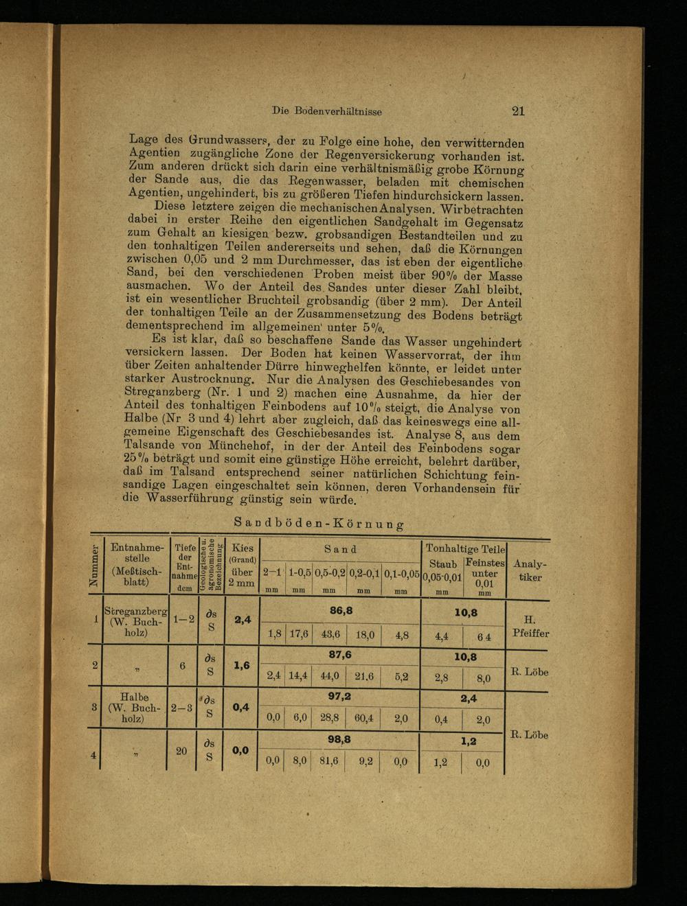 Es ist klar, daß so beschaffene Sande das Wasser ungehindert versickern lassen. Der Boden hat keinen Wasservorrat, der ihm über Zeiten anhaltender Dürre hinweghelfen könnte, er leidet unter starker Austrocknung. Nur die Analysen des Geschiebesandes von Streganzberg (Nr. 1 und 2) machen eine Ausnahme, da hier der Anteil des tonhaltigen Feinbodens auf 10°/o steigt, die Analyse von Halbe (Nr 3 und 4) lehrt aber zugleich, daß das keineswegs eine allgemeine Eigenschaft des Geschiebesandes ist. Analyse 8, aus dem Talsande von Münchehof , in der der Anteil des Feinbodens sogar 25°/o beträgt und somit eine günstige Höhe erreicht, belehrt darüber, daß im Talsand entsprechend seiner natürlichen Schichtung feinsandige Lagen eingeschaltet sein können, deren Vorhandensein für die Wasserführung günstig sein würde.