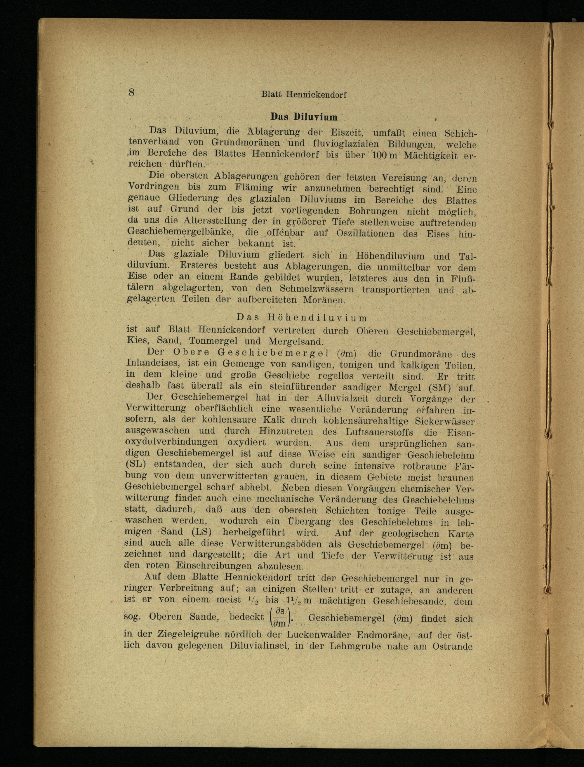 Das Diluvium, die Ablagerung der Eiszeit, umfaßt einen Schichtenverband von Grundmoränen und fluvioglazialen Bildungen, welche im Bereiche des Blattes Hennickendorf bis über 100 m Mächtigkeit erreichen dürften.