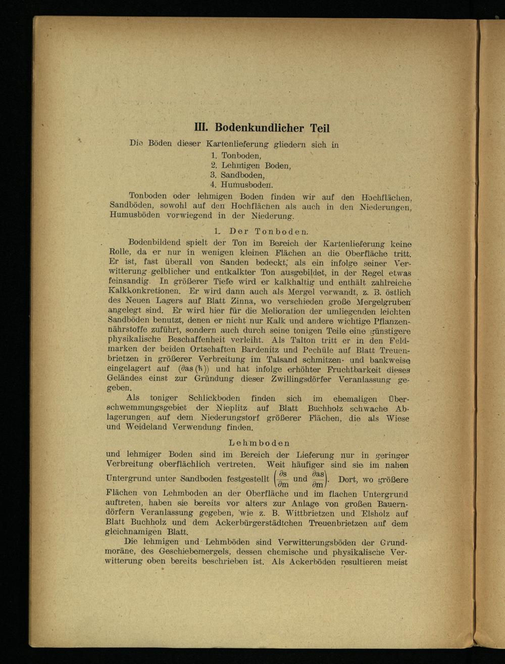 Bodenbildend spielt der Ton im Bereich der Kartenlieferung keine Rolle, da er nur in wenigen kleinen Flächen an die Oberfläche tritt. Er ist, fast überall von Sanden bedeckt; als ein infolge seiner Verwitterung gelblicher und entkalkter Ton ausgebildet, in der Regel etwas feinsandig. In größerer Tiefe wird er kalkhaltig und enthält zahlreiche Kalkkonkretionen. Er wird dann auch als Mergel verwandt, z. B. östlich des Neuen Lagers auf Blatt Zinna, wo verschieden große Mergelgruben angelegt sind. Er wird hier für die Melioration der umliegenden leichten Sandböden benutzt, denen er nicht nur Kalk und andere wichtige Pflanzen- nährstoffe zuführt, sondern auch durch seine tonigen Teile eine günstigere physikalische Beschaffenheit verleiht. Als Talton tritt er in den Feldmarken der beiden Ortschaften Bardenitz und Pechüle auf Blatt Treuen- brietzen in größerer Verbreitung im Talsand schmitzen- und bankweise eingelagert auf (9as(h)) und hat infolge erhöhter Fruchtbarkeit dieses Geländes einst zur Gründung dieser Zwillingsdörfer Veranlassung gegeben.