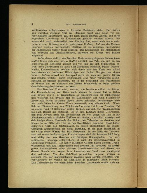 Außer dieser südlich des Baruther Urstromtals gelegenen Endmoränenstaffel findet sich eine zweite Staffel nördlich des Tals, die sich an den Luckenwalder Höhenzug anlehnt und von hier aus sich bogenförmig sowohl nach Nordwesten als auch nach Nordosten ausdehnt. Dieser Lucken walder Endmoränenzug zeichnet sich durch eine lose Kette von scharf hervortretenden, isolierten Höhenzügen und hohen Kuppen aus, deren innerer Aufbau sowohl aus Blockpackungen als auch aus groben Kiesen und Sanden besteht. Diese Endmoränen sind einer vorwiegend kiesigsandigen Hochfläche aufgesetzt, die in der Umgegend von Wittbrietzen im Westen und am Nordrand des Blattes Schönweide im Osten größere Geschiebemergelvorkommen aufweist.