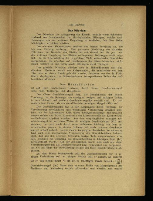 Das Diluvium, die Ablagerung der Eiszeit, umfaßt einen Schichten- verband von Grundmoräne und fluvioglazialen Bildungen, welche nach Bohrungen aus der weiteren Umgebung zu schließen, bis über 100 m Mächtigkeit erreichen dürften.
