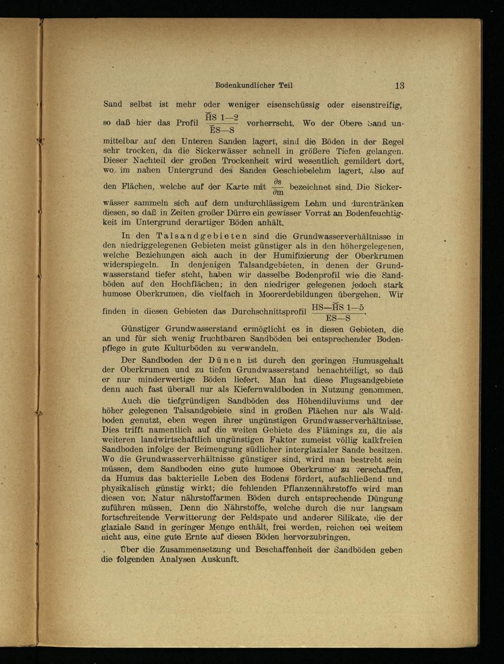 Auch die tiefgründigen Sandböden des Höhendiluviums und der höher gelegenen Talsandgebiete sind in großen Flächen nur als Waldboden genutzt, eben wegen ihrer ungünstigen Grundwasser Verhältnisse. Dies trifft namentlich auf die weiten Gebiete des Flämings zu, die als weiteren landwirtschaftlich ungünstigen Faktor zumeist völlig kalkfreien Sandboden infolge der Beimengung südlicher interglazialer Sande besitzen. Wo die Grundwasserverhältnisse günstiger sind, wird man bestrebt sein müssen, dem Sandboden eine gute humose Oberkrume zu verschaffen, da Humus das bakterielle Leben des Bodens fördert, aufschließend und physikalisch günstig wirkt; die fehlenden Pflanzemnährstoffe wird man diesen von Natur nährstoffarmen Böden durch entsprechende Düngung zuführen müssen. Denn die Nährstoffe, welche durch die nur langsam fortschreitende Verwitterung der Feldspate und anderer Silikate, die der glaziale Sand in geringer Menge enthält, frei werden, reichen bei weitem nicht aus, eine gute Ernte auf diesen Böden hervorzubringen.