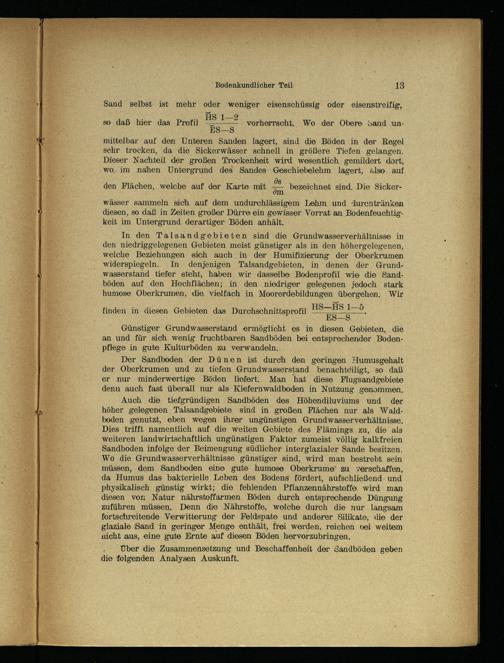 In den Tals andgebieten sind die Grundwasserverhältnisse in den niedriggelegenen Gebieten meist günstiger als in den höhergelegenen, welche Beziehungen siceh auch in der Humifizierung der Oberkrumen widerspiegeln. In denjenigen Talsandgebieten, in denen der Grundwasserstand tiefer steht, haben wir dasselbe Bodenprofil wie die Sandböden auf den Hochflächen; in den niedriger gelegenen jedoch stark humose Oberkrumen, die vielfach in Moorerdebildungen übergehen. Wir