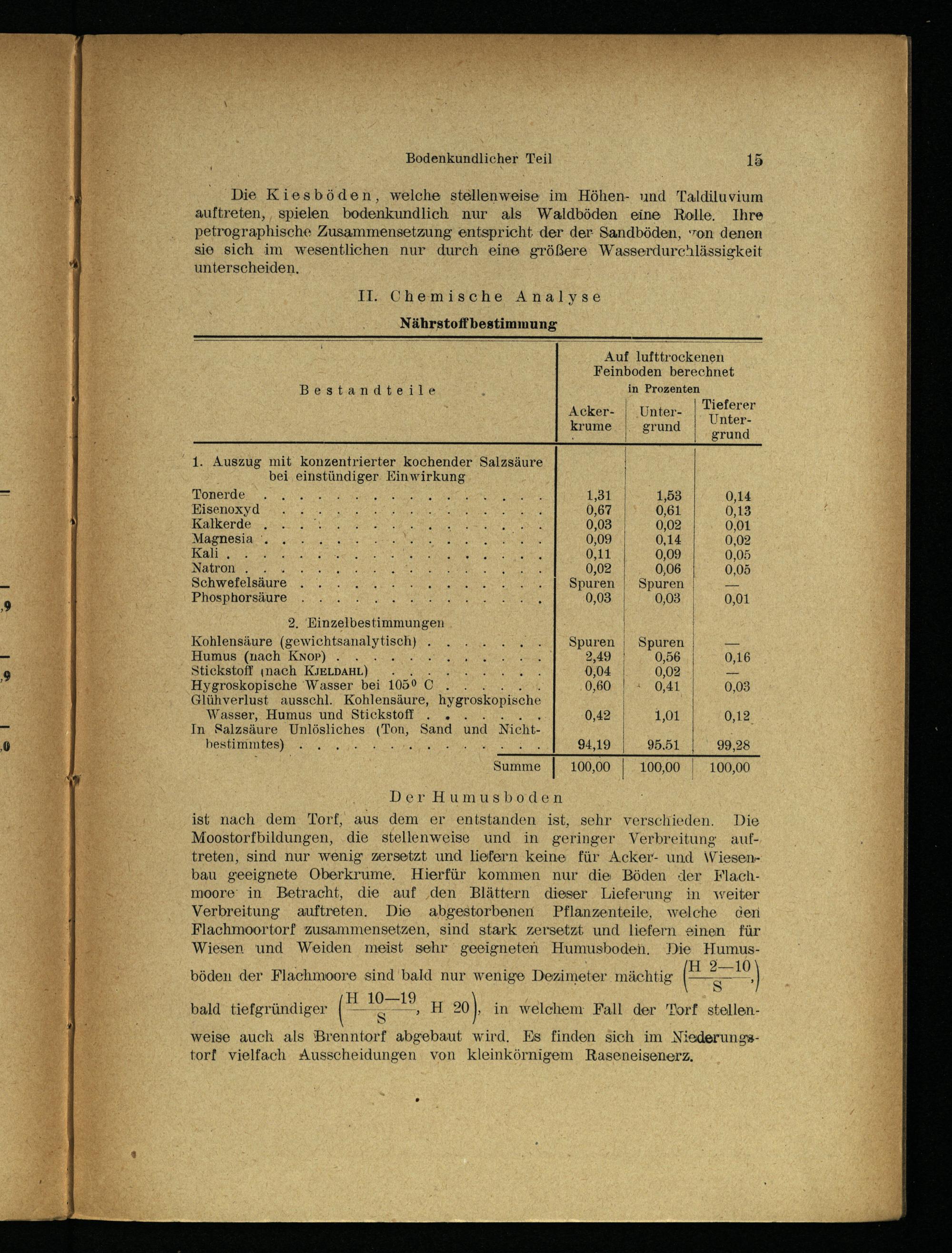 ist nach dem Torf, aus dem er entstanden ist, sehr verschieden. Die Moostorfbildungen, die stellenweise und in geringer Verbreitung auftreten, sind nur wenig zersetzt und liefern keine für Acker- und Wiesenbau geeignete Oberkrume. Hierfür kommen nur die Böden der Flachmoore in Betracht, die auf den Blättern dieser Lieferung in weiter Verbreitung auftreten. Die abgestorbenen Pflanzenteile, welche den Flachmoortorf zusammensetzen, sind stark zersetzt und liefern einen für Wiesen und Weiden meist sehr geeigneten Humusboden. Die Humus-