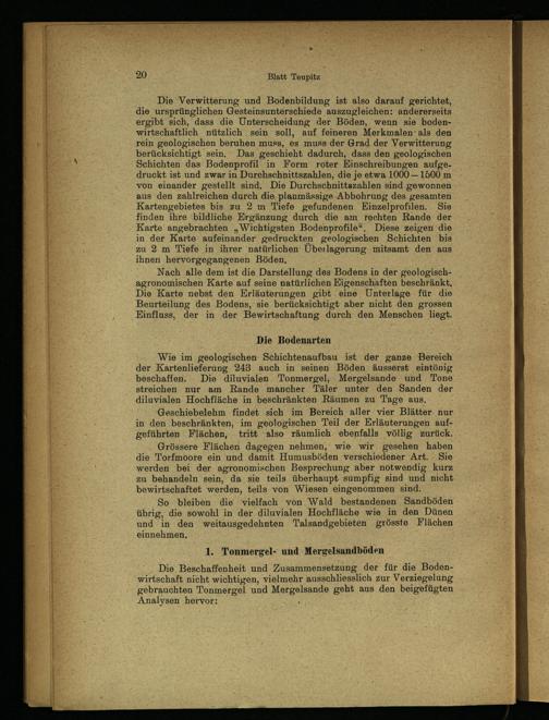 Die Verwitterung und Bodenbildung ist also darauf gerichtet, die ursprünglichen Gesteinsunterschiede auszugleichen: andererseits ergibt sich, dass die Unterscheidung der Böden, wenn sie bodenwirtschaftlich nützlich sein soll, auf feineren Merkmalen als den rein geologischen beruhen muss, es muss der Grad der Verwitterung berücksichtigt sein. Das geschieht dadurch, dass den geologischen Schichten das Bodenprofil in Form roter Einschreibungen aufgedruckt ist und zwar in Durchschnittszahlen, die je etwa 1000—1500 m von einander gestellt sind. Die Durchschnittszahlen sind gewonnen aus den zahlreichen durch die planmässige Abbohrung des gesamten Kartengebietes bis zu 2 m Tiefe gefundenen Einzelprofilen. Sie finden ihre bildliche Ergänzung durch die am rechten Rande der Karte angebrachten „Wichtigsten Bodenprofile“. Diese zeigen die in der Karte aufeinander gedruckten geologischen Schichten bis zu 2 m Tiefe in ihrer natürlichen Überlagerung mitsamt den aus ihnen hervorgegangenen Böden.
