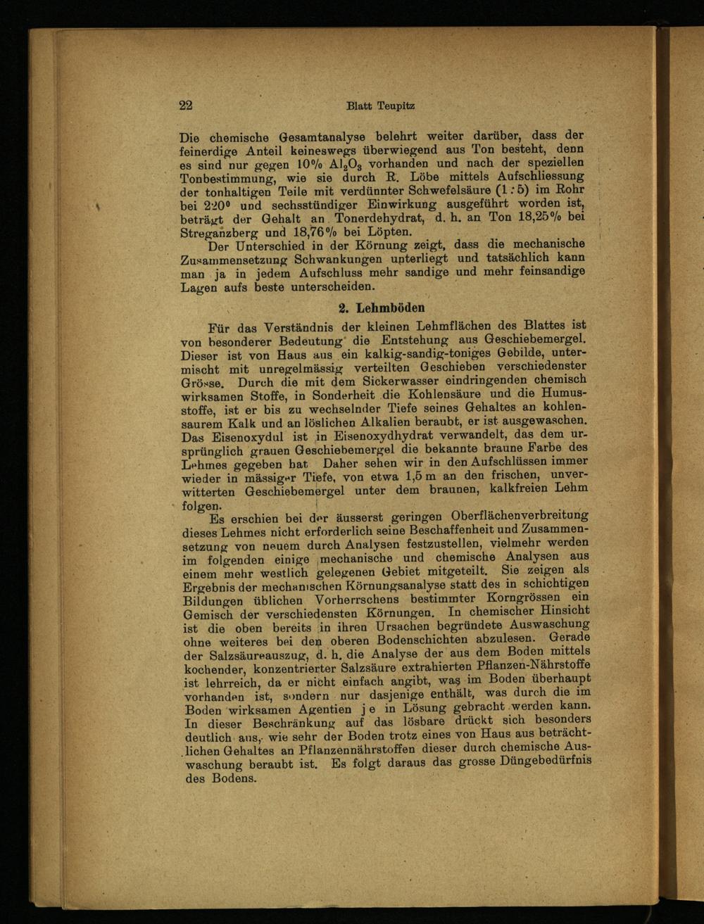 Es erschien bei der äusserst geringen Oberflächenverbreitung dieses Lehmes nicht erforderlich seine Beschaffenheit und Zusammensetzung von neuem durch Analysen festzustellen, vielmehr werden im folgenden einige mechanische und chemische Analysen aus einem mehr westlich gelegenen Gebiet mitgeteilt. Sie zeigen als Ergebnis der mechanischen Körnungsanalyse statt des in schichtigen Bildungen üblichen Vorherrschens bestimmter Korngrössen ein Gemisch der verschiedensten Körnungen. In chemischer Hinsicht ist die oben bereits in ihren Ursachen begründete Auswaschung ohne weiteres bei den oberen Bodenschichten abzulesen. Gerade der Salzsäureauszug, d. h. die Analyse der aus dem Boden mittels kochender, konzentrierter Salzsäure extrahierten Pflanzen-Nährstoffe ist lehrreich, da er nicht einfach angibt, was im Boden überhaupt vorhanden ist, sondern nur dasjenige enthält, was durch die im Boden wirksamen Agentien je in Lösung gebracht werden kann. In dieser Beschränkung auf das lösbare drückt sich besonders deutlich aus,- wie sehr der Boden trotz eines von Haus aus beträcht- lichen Gehaltes an Pflanzennährstoffen dieser durch chemische Auswaschung beraubt ist. Es folgt daraus das grosse Düngebedürfnis des Bodens.