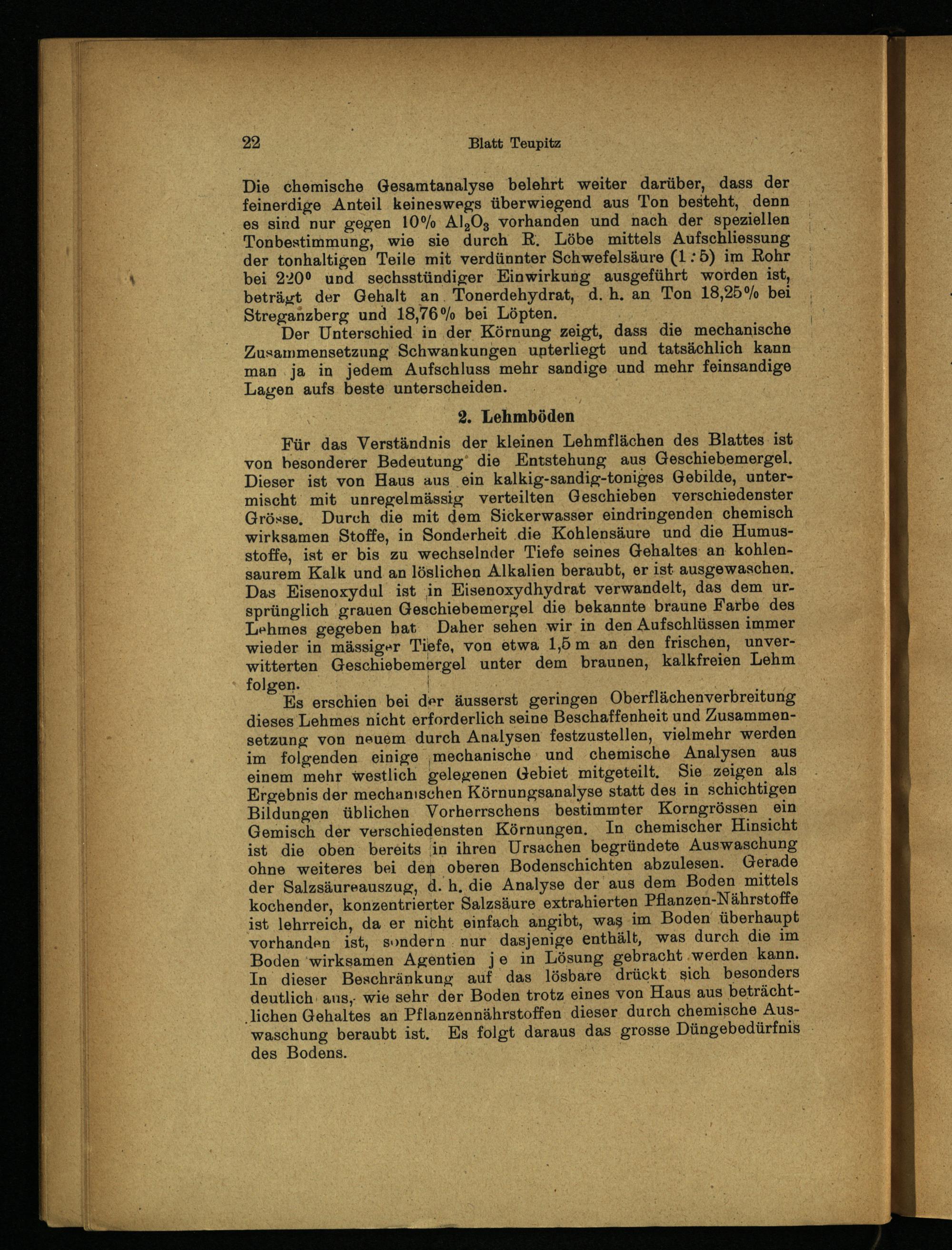 Die chemische Gesamtanalyse belehrt weiter darüber, dass der feinerdige Anteil keineswegs überwiegend aus Ton besteht, denn es sind nur gegen 10% Al 2 0 3 vorhanden und nach der speziellen Tonbestimmung, wie sie durch R. Löbe mittels Aufschliessung der tonhaltigen Teile mit verdünnter Schwefelsäure (1:5) im Rohr bei 220° und sechsstündiger Einwirkung ausgeführt worden ist, beträgt der Gehalt an Tonerdehydrat, d. h. an Ton 18,25% bei Streganzberg und 18,76% bei Löpten.