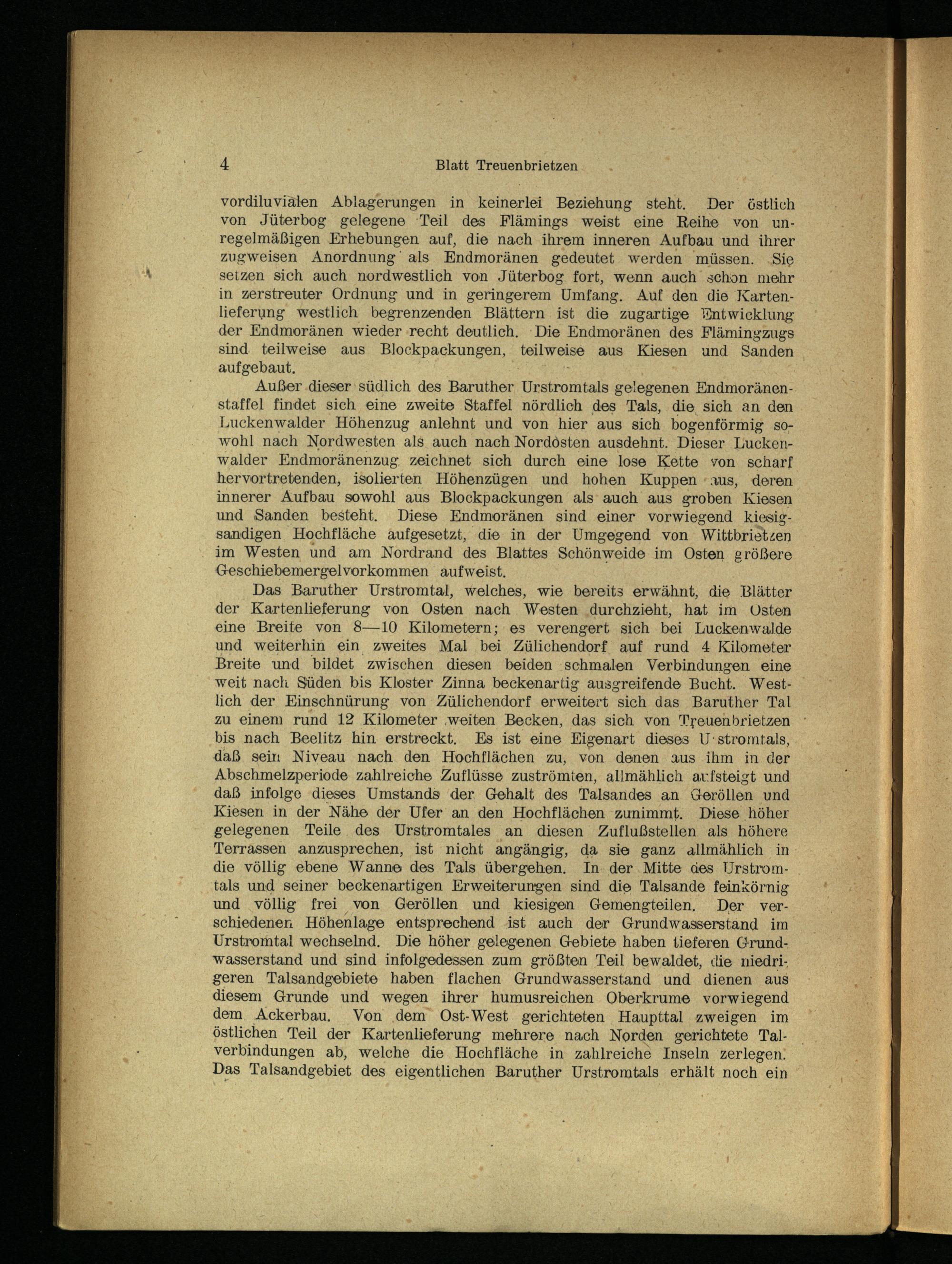 Das Baruther Urstromtal, welches, wie bereits erwähnt, die Blätter der Kartenlieferung von Osten nach Westen durchzieht, hat im Osten eine Breite von 8—10 Kilometern; es verengert sich bei Luckenwalde und weiterhin ein zweites Mal bei Zülichendorf auf rund 4 Kilometer Breite und bildet zwischen diesen beiden schmalen Verbindungen eine weit nach Süden bis Kloster Zinna beckenartig ausgreifende Bucht. Westlich der Einschnürung von Zülichendorf erweitert sich das Baruther Tal zu einem rund 12 Kilometer weiten Becken, das sich von Treuenbrietzen bis nach Beelitz hin erstreckt. Es ist eine Eigenart dieses Urstromtals, daß sein Niveau nach den Hochflächen zu, von denen aus ihm in der Abschmelzperiode zahlreiche Zuflüsse zuströmten, allmählich ansteigt und daß infolge dieses Umstands der Gehalt des Talsandes an Geröllen und Kiesen in der Nähe der Ufer an den Hochflächen zunimmt. Diese höher gelegenen Teile des Urstromtales an diesen Zuflußstellen als höhere Terrassen anzusprechen, ist nicht angängig, da sie ganz allmählich in die völlig ebene Wanne des Tals übergehen. In der Mitte des Urstromtals und seiner beckenartigen Erweiterungen sind die Talsande feinkörnig und völlig frei von Geröllen und kiesigen Gemengteilen. Der verschiedenen Höhenlage entsprechend ist auch der Grundwasserstand im Urstromtal wechselnd. Die höher gelegenen Gebiete haben tieferen Grundwasserstand und sind infolgedessen zum größten Teil bewaldet, die niedrigeren Talsandgebiete haben flachen Grundwasserstand und dienen aus diesem Grunde und wegen ihrer humusreichen Oberkrume vorwiegend dem Ackerbau. Von dem Ost-West gerichteten Haupttal zweigen im östlichen Teil der Kartenlieferung mehrere nach Norden gerichtete Talverbindungen ab, welche die Hochfläche in zahlreiche Inseln zerlegen. Das Talsandgebiet des eigentlichen Baruther Urstromtals erhält noch ein
