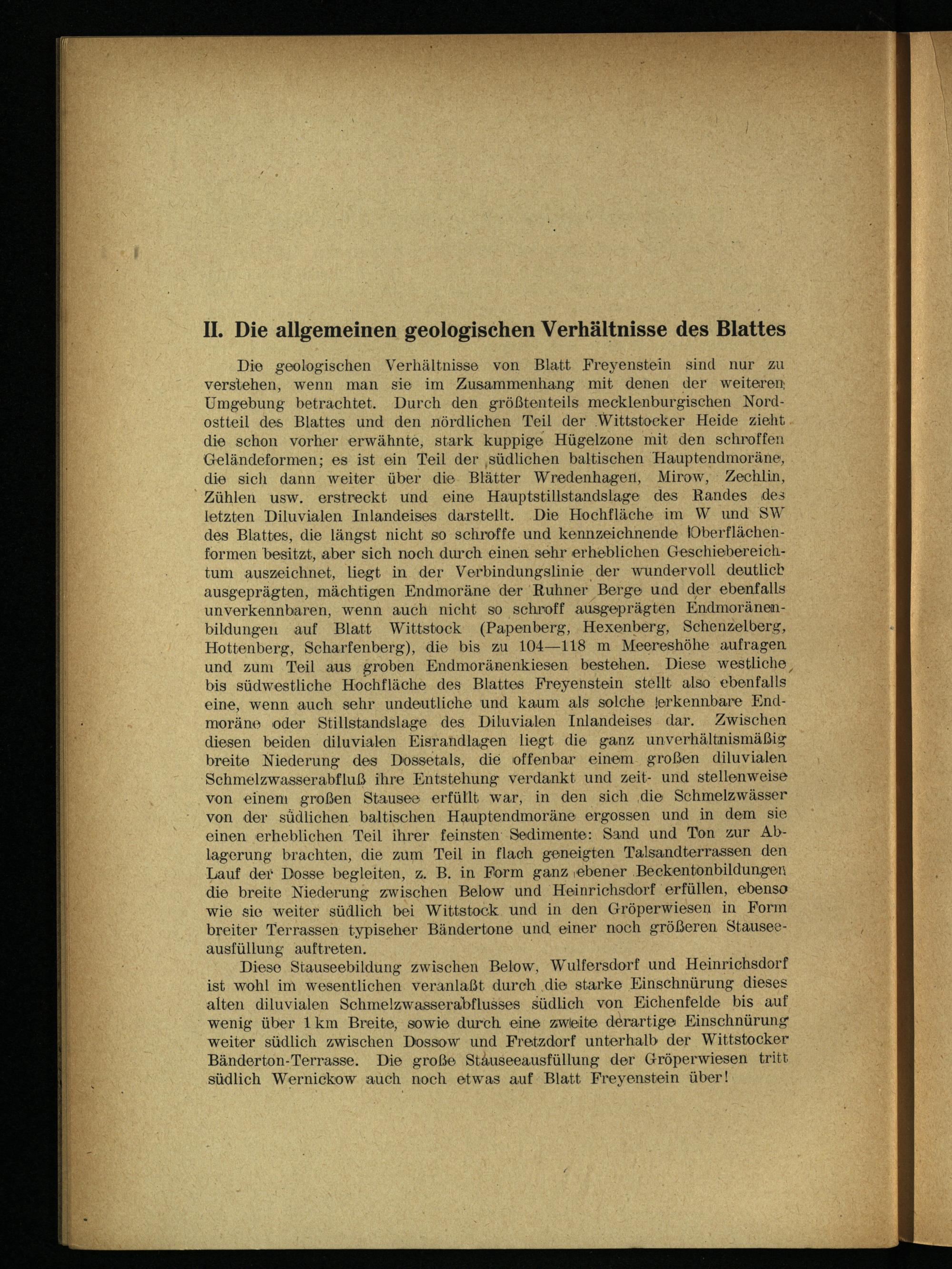 Die geologischen Verhältnisse von Blatt Freyenstein sind nur zu verstehen, wenn man sie im Zusammenhang mit denen der weiteren; Umgebung betrachtet. Durch den größtenteils mecklenburgischen Nordostteil des Blattes und den nördlichen Teil der Wittstocker Heide zieht die schon vorher erwähnte, stark kuppige Hügelzone mit den schroffen Geländeformen; es ist ein Teil der .südlichen baltischen Hauptendmoräne, die sich dann weiter über die Blätter Wredenhagen , Mirow , Zechlin , Zühlen usw. erstreckt und eine Hauptstillstandslage des Randes des letzten Diluvialen Inlandeises darstellt. Die Hochfläche im VV und SW des Blattes, die längst nicht so schroffe und kennzeichnende Oberflächen- formen besitzt, aber sich noch durch einen sehr erheblichen Geschiebereichtum auszeichnet, liegt in der Verbindungslinie der wundervoll deutlich ausgeprägten, mächtigen Endmoräne der Ruhner Berge und der ebenfalls unverkennbaren, wenn auch nicht so schroff ausgeprägten Endmoränenbildungen auf Blatt Wittstock (Papenberg, Hexenberg, Schenzelberg, Hottenberg, Scharfenberg), die bis zu 104—118 m Meereshöhe aufragen und zum Teil aus groben Endmoränenkiesen bestehen. Diese westliche, bis südwestliche Hochfläche des Blattes Freyenstein stellt also ebenfalls eine, wenn auch sehr undeutliche und kaum als solche lerkennbare Endmoräne oder Stillstandslage des Diluvialen Inlandeises dar. Zwischen diesen beiden diluvialen Eisrandlagen liegt die ganz unverhältnismäßig breite Niederung des Dossetals, die offenbar einem großen diluvialen Schmelzwasserabfluß ihre Entstehung verdankt und zeit- und stellenweise von einem großen Stausee erfüllt war, in den sich die Schmelzwässer von der südlichen baltischen Hauptendmoräne ergossen und in dem sie einen erheblichen Teil ihrer feinsten Sedimente: Sand und Ton zur Ablagerung brachten, die zum Teil in flach geneigten Talsandterrassen den Lauf der Dosse begleiten, z. B. in Form ganz ebener Beckentonbildungen die breite Niederung zwischen Below und Heinrichsdorf erfüllen, ebenso wie sie weiter südlich bei Wittstock und in den Gröperwiesen in Form breiter Terrassen typischer Bändertone und einer noch größeren Stauseeausfüllung auftreten.
