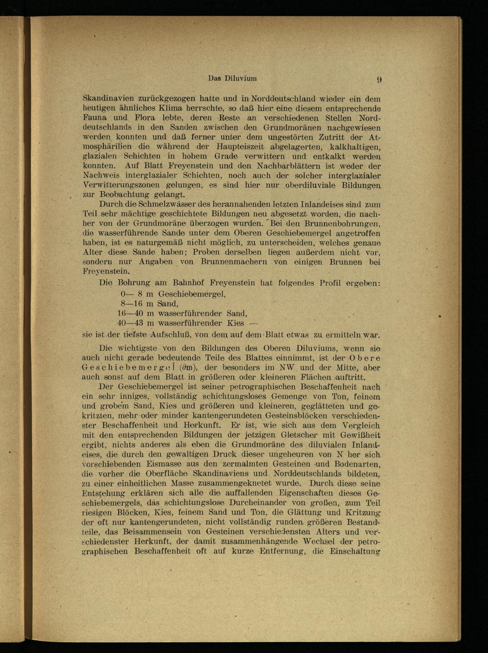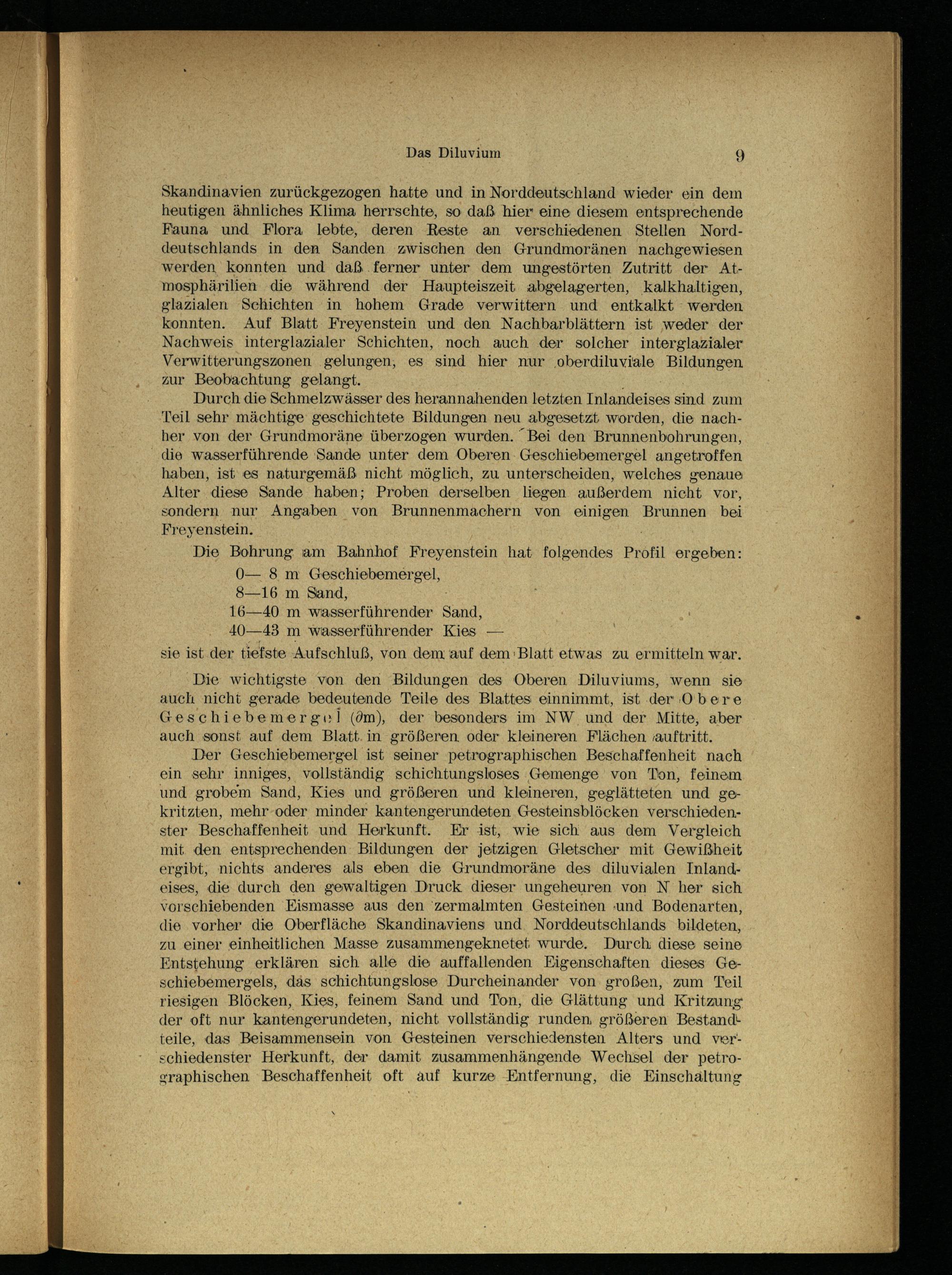 Skandinavien zurückgezogen hatte und in Norddeutschland wieder ein dem heutigen ähnliches Klima herrschte, so daß hier eine diesem entsprechende Fauna und Flora lebte, deren Reste an verschiedenen Stellen Norddeutschlands in den Sanden zwischen den Grundmoränen nachgewiesen werden konnten und daß ferner unter dem ungestörten Zutritt der Atmosphärilien die während der Haupteiszeit abgelagerten, kalkhaltigen, glazialen Schichten in hohem Grade verwittern und entkalkt werden konnten. Auf Blatt Freyenstein und den Nachbarblättern ist weder der Nachweis interglazialer Schichten, noch auch der solcher interglazialer Verwitterungszonen gelungen, es sind hier nur oberdiluviäle Bildungen zur Beobachtung gelangt.