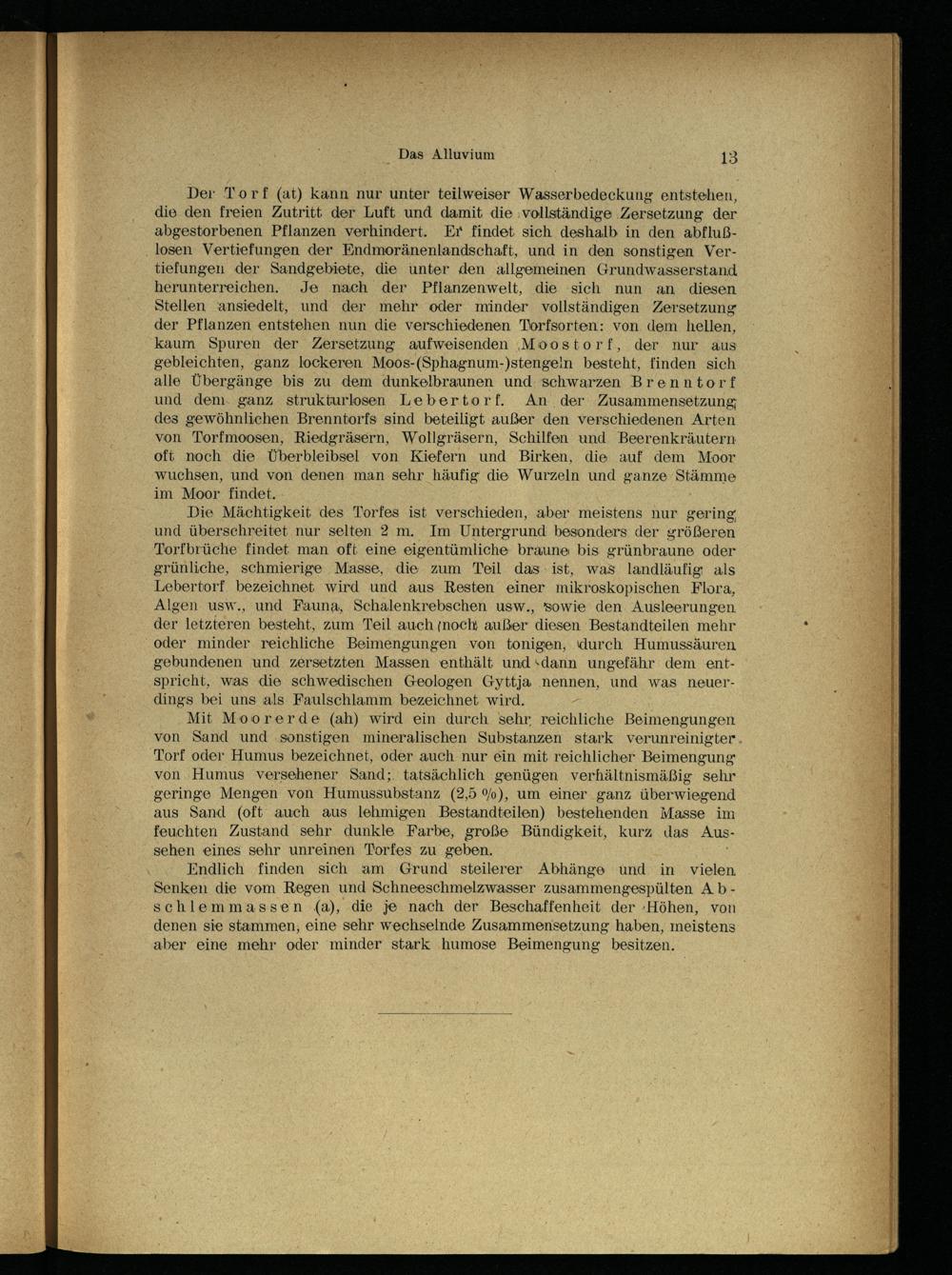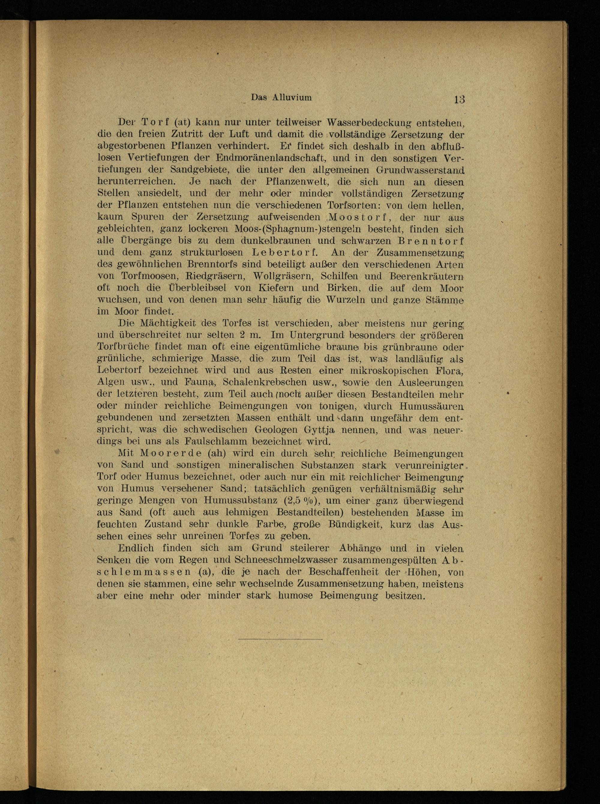 Der Torf (at) kann nur unter teilweiser Wasserbedeckung entstehen, die den freien Zutritt der Luft und damit die vollständige Zersetzung der abgestorbenen Pflanzen verhindert. Er findet sich deshalb in den abflußlosen Vertiefungen der Endmoränenlandschaft, und in den sonstigen Vertiefungen der Sandgebiete, die unter den allgemeinen Grundwasserstand herunterreichen. Je nach der Pflanzenwelt, die sich nun an diesen Stellen ansiedelt, und der mehr oder minder vollständigen Zersetzung der Pflanzen entstehen nun die verschiedenen Torfsorten: von dem hellen, kaum Spuren der Zersetzung aufweisenden Moostorf, der nur aus gebleichten, ganz lockeren Moos-(Sphagnum-)stengeln besteht, finden sich alle Übergänge bis zu dem dunkelbraunen und schwarzen Brenntorf und dem ganz strukturlosen Lebertorf. An der Zusammensetzung des gewöhnlichen Brenntorfs sind beteiligt außer den verschiedenen Arten von Torfmoosen, Riedgräsern, Wollgräsern, Schilfen und Beerenkräutern oft noch die Überbleibsel von Kiefern und Birken, die auf dem Moor wuchsen, und von denen man sehr häufig die Wurzeln und ganze Stämme im Moor findet.
