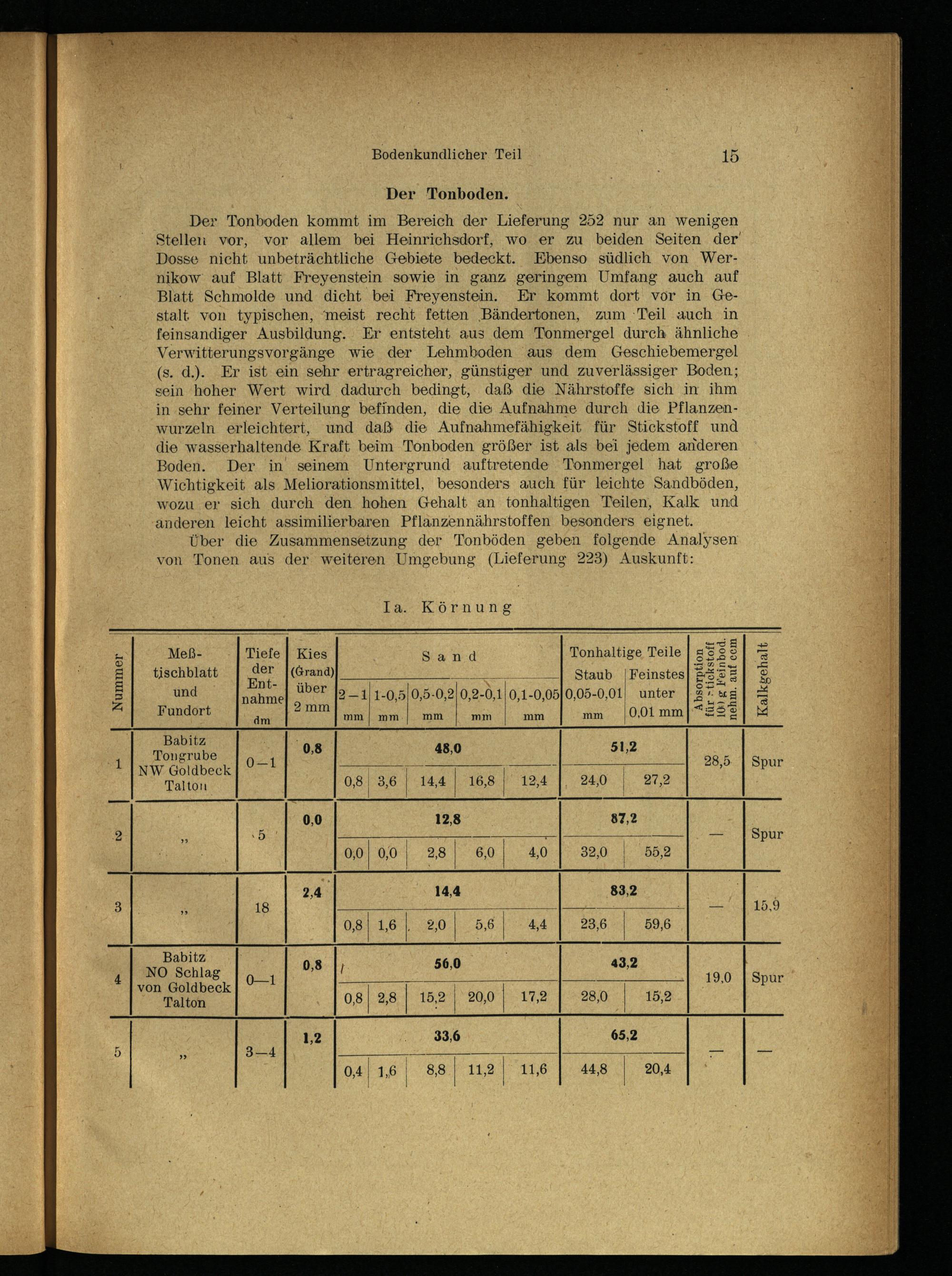 Der Tonboden kommt im Bereich der Lieferung 252 nur an wenigen Stellen vor, vor allem bei Heinrichsdorf, wo er zu beiden Seiten der Dosse nicht unbeträchtliche Gebiete bedeckt. Ebenso südlich von Wer- nikow auf Blatt Freyenstein sowie in ganz geringem Umfang auch auf Blatt Schmolde und dicht bei Freyenstein . Er kommt dort vor in Gestalt von typischen, meist recht fetten Bändertonen, zum Teil auch in feinsandiger Ausbildung. Er entsteht aus dem Tonmergel durch ähnliche Verwitterungsvorgänge wie der Lehmboden aus dem Geschiebemergel (s. d.). Er ist ein sehr ertragreicher, günstiger und zuverlässiger Boden; sein hoher Wert wird dadurch bedingt, daß die Nährstoffe sich in ihm in sehr feiner Verteilung befinden, die die Aufnahme durch die Pflanzenwurzeln erleichtert, und daß- die Aufnahmefähigkeit für Stickstoff und die wasserhaltende Kraft beim Tonboden größer ist als bei jedem anderen Boden. Der in seinem Untergrund auf tretende Tonmergel hat große Wichtigkeit als Meliorationsmittel, besonders auch für leichte Sandböden, wozu er sich durch den hohen Gehalt an tonhaltigen Teilen, Kalk und anderen leicht assimilierbaren Pflanzennährstoffen besonders eignet.