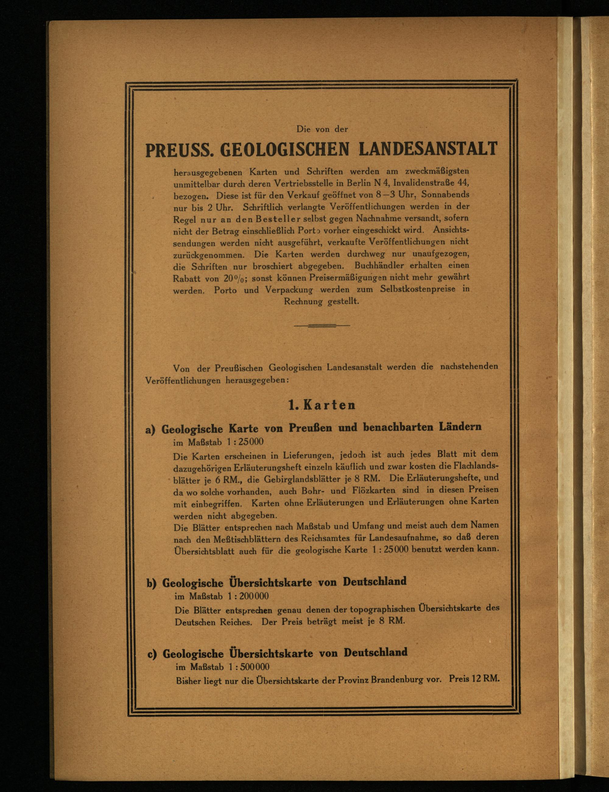 herausgegebenen Karten und Schriften werden am zweckmäßigsten unmittelbar durch deren Vertriebsstelle in Berlin N 4, Invalidenstraße 44, bezogen. Diese ist für den Verkauf geöffnet von 8-3 Uhr, Sonnabends nur bis 2 Uhr. Schriftlich verlangte Veröffentlichungen werden in der Regel nur an den Besteller selbst gegen Nachnahme versandt, sofern nicht der Betrag einschließlich Porto vorher eingeschickt wird. Ansichtssendungen werden nicht ausgeführt, verkaufte Veröffentlichungen nicht zurückgenommen. Die Karten werden durchweg nur unaufgezogen, die Schriften nur broschiert abgegeben. Buchhändler erhalten einen Rabatt von 20%; sonst können Preisermäßigungen nicht mehr gewährt werden. Porto und Verpackung werden zum Selbstkostenpreise in Rechnung gestellt.