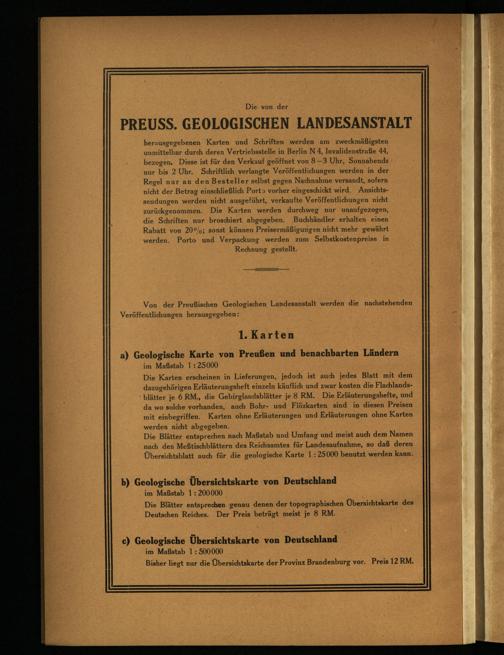 Die Karten erscheinen in Lieferungen, jedoch ist auch jedes Blatt mit dem dazugehörigen Erläuterungsheft einzeln käuflich und zwar kosten die Flachlandsblätter je 6 RM., die Gebirglandsblätter je 8 RM. Die Erläuterungshefte, und da wo solche vorhanden, auch Bohr- und Flözkarten sind in diesen Preisen mit einbegriffen. Karten ohne Erläuterungen und Erläuterungen ohne Karten werden nicht abgegeben.