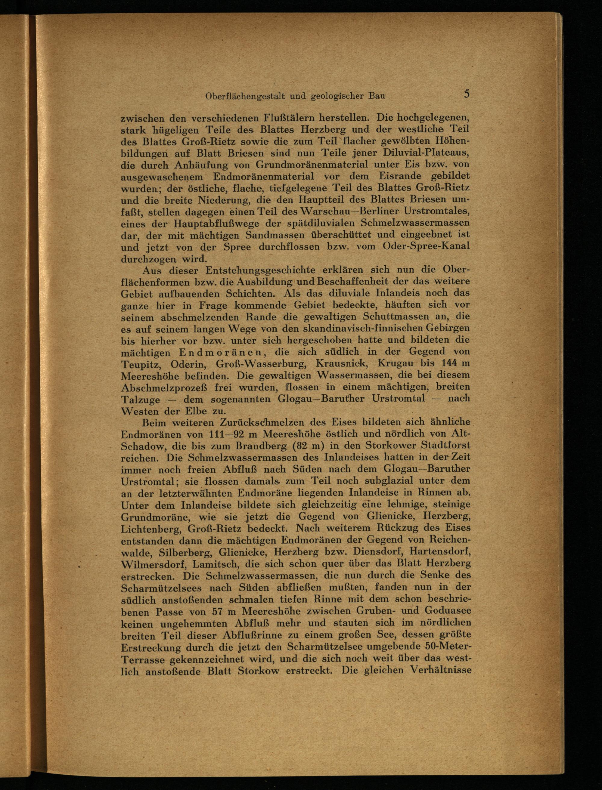 Beim weiteren Zurückschmelzen des Eises bildeten sich ähnliche Endmoränen von 111—92 m Meereshöhe östlich und nördlich von Alt- Schadow, die bis zum Brandberg (82 m) in den Storkower Stadtforst reichen. Die Schmelzwassermassen des Inlandeises hatten in der Zeit immer noch freien Abfluß nach Süden nach dem Glogau—Baruther Urstromtal; sie flössen damals, zum Teil noch subglazial unter dem an der letzterwähnten Endmoräne liegenden Inlandeise in Rinnen ab. Unter dem Inlandeise bildete sich gleichzeitig eine lehmige, steinige Grundmoräne, wie sie jetzt die Gegend von Glienicke, Herzberg , Lichtenberg, Groß-Rietz bedeckt. Nach weiterem Rückzug des Eises entstanden dann die mächtigen Endmoränen der Gegend von Reichen walde , Silberberg, Glienicke, Herzberg bzw. Diensdorf, Hartensdorf, Wilmersdorf , Lamitsch, die sich schon quer über das Blatt Herzberg erstrecken. Die Schmelzwassermassen, die nun durch die Senke des Scharmützelsees nach Süden abfließen mußten, fanden nun in der südlich anstoßenden schmalen tiefen Rinne mit dem schon beschriebenen Passe von 57 m Meereshöhe zwischen Gruben- und Goduasee keinen ungehemmten Abfluß mehr und stauten sich im nördlichen breiten Teil dieser Abflußrinne zu einem großen See, dessen größte Erstreckung durch die jetzt den Scharmützelsee umgebende 50-Meter- Terrasse gekennzeichnet wird, und die sich noch weit über das westlich anstoßende Blatt Storkow erstreckt. Die gleichen Verhältnisse